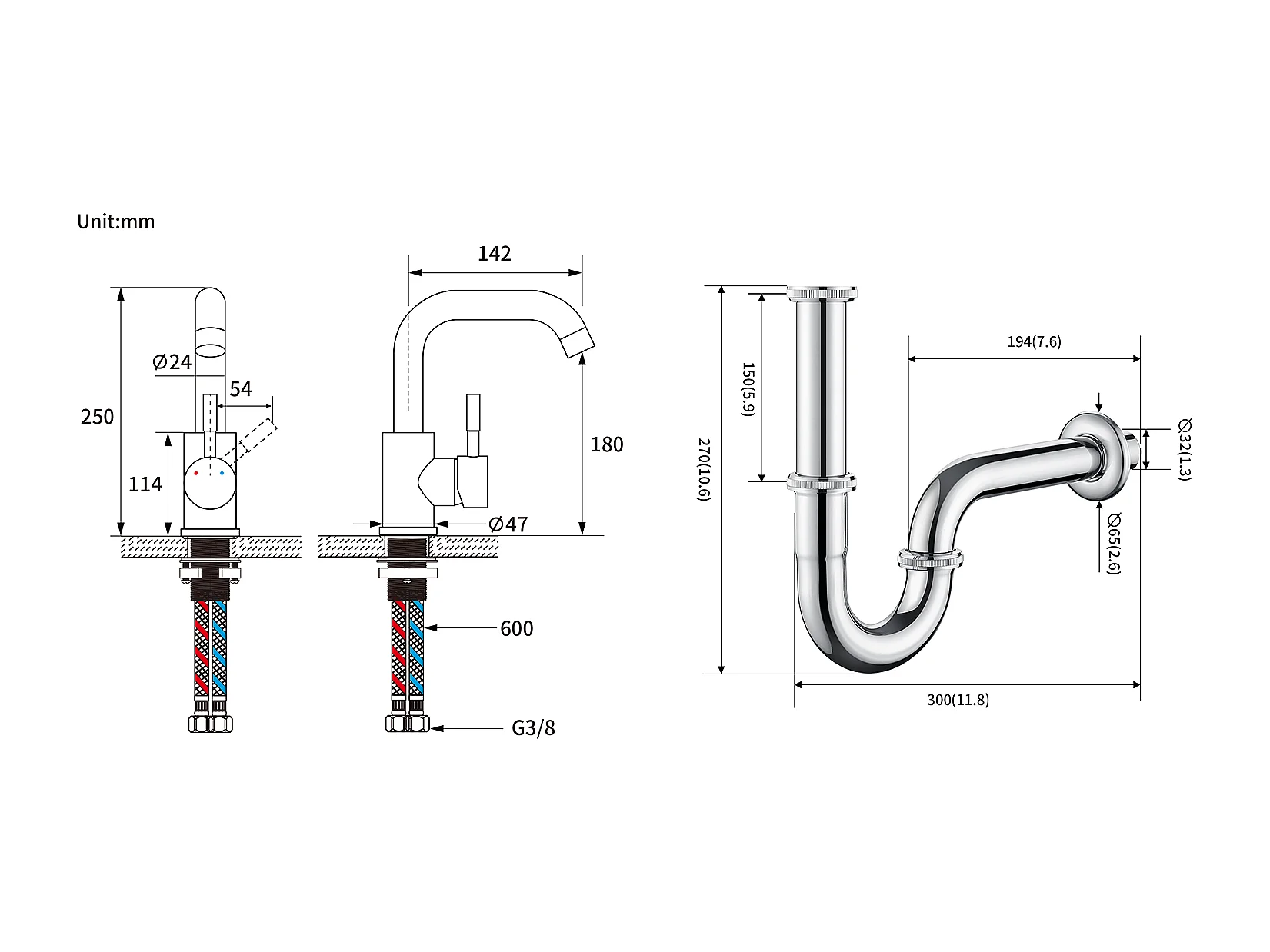 Robinet Lavabo Blanc Rotation 360°,Barboteur démontable,Eau froide/chaude+Siphon Lavabo Forme U Tube Siphon Inox Anti-odeurs,Ø32 mm,Chromé