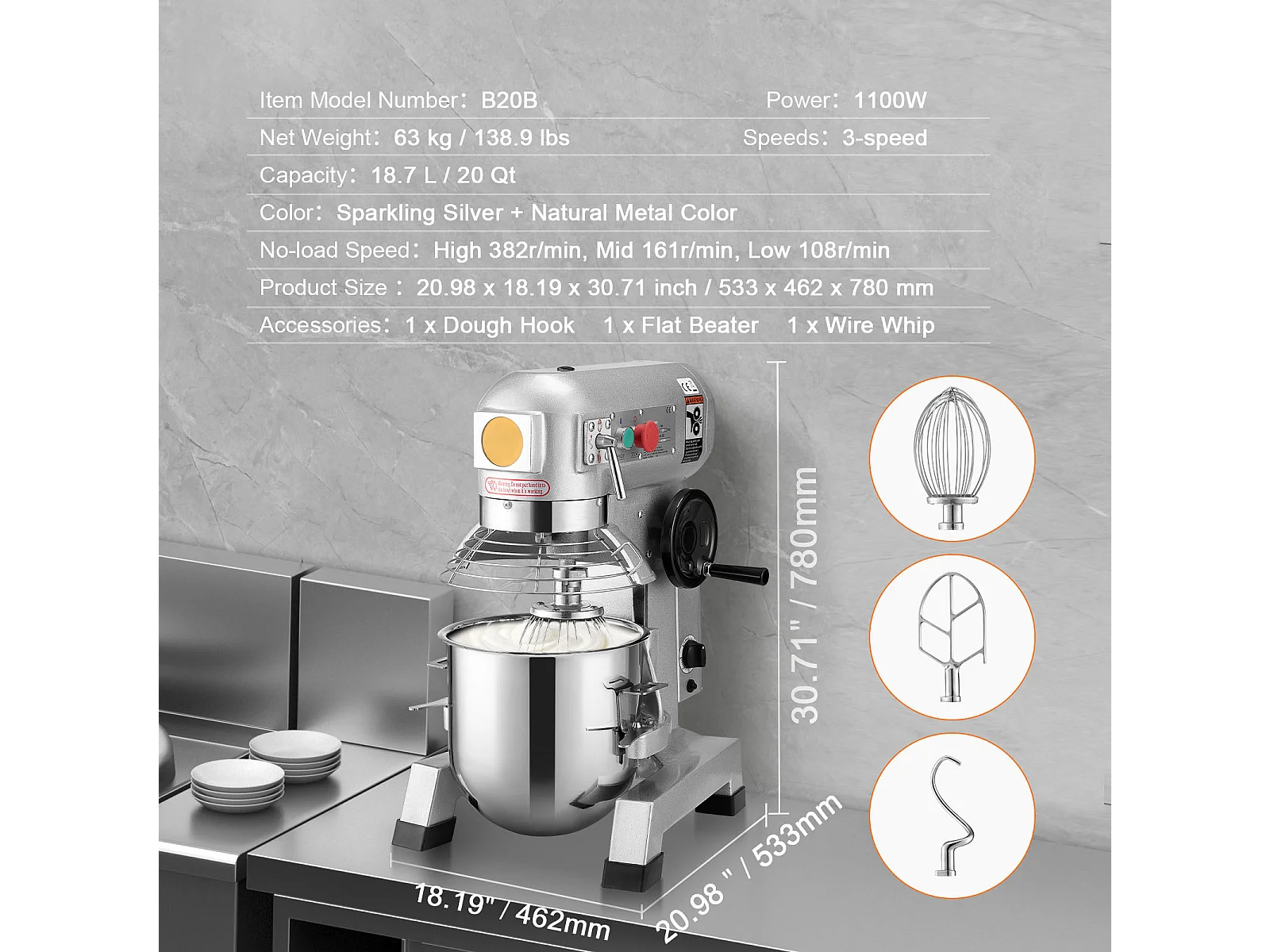 Mixeur Alimentaire Commercial SucceBuy 18,7 L 1100 W 3 Vitesses Mélangeur de Pâte sur Socle pour Restaurant