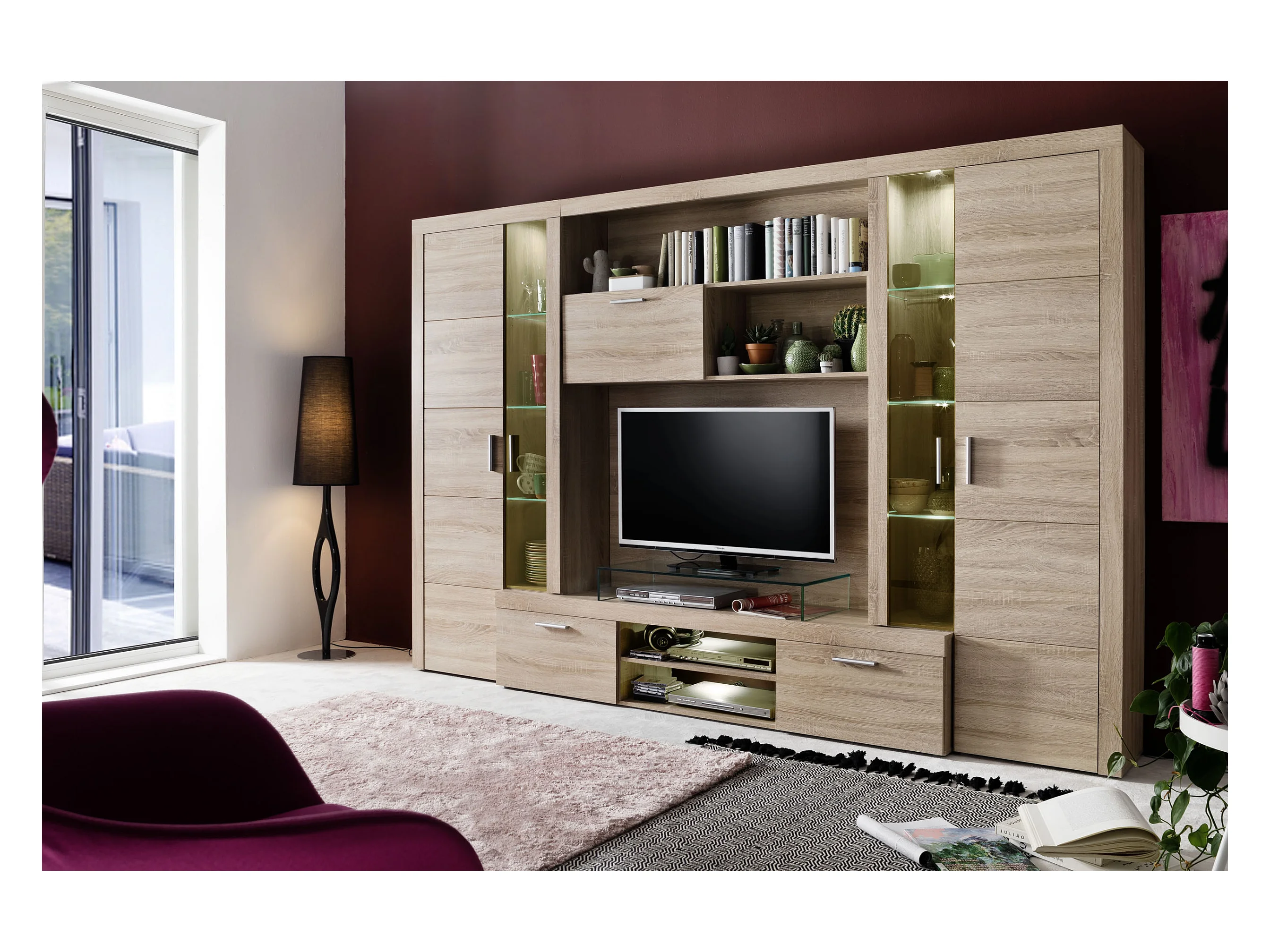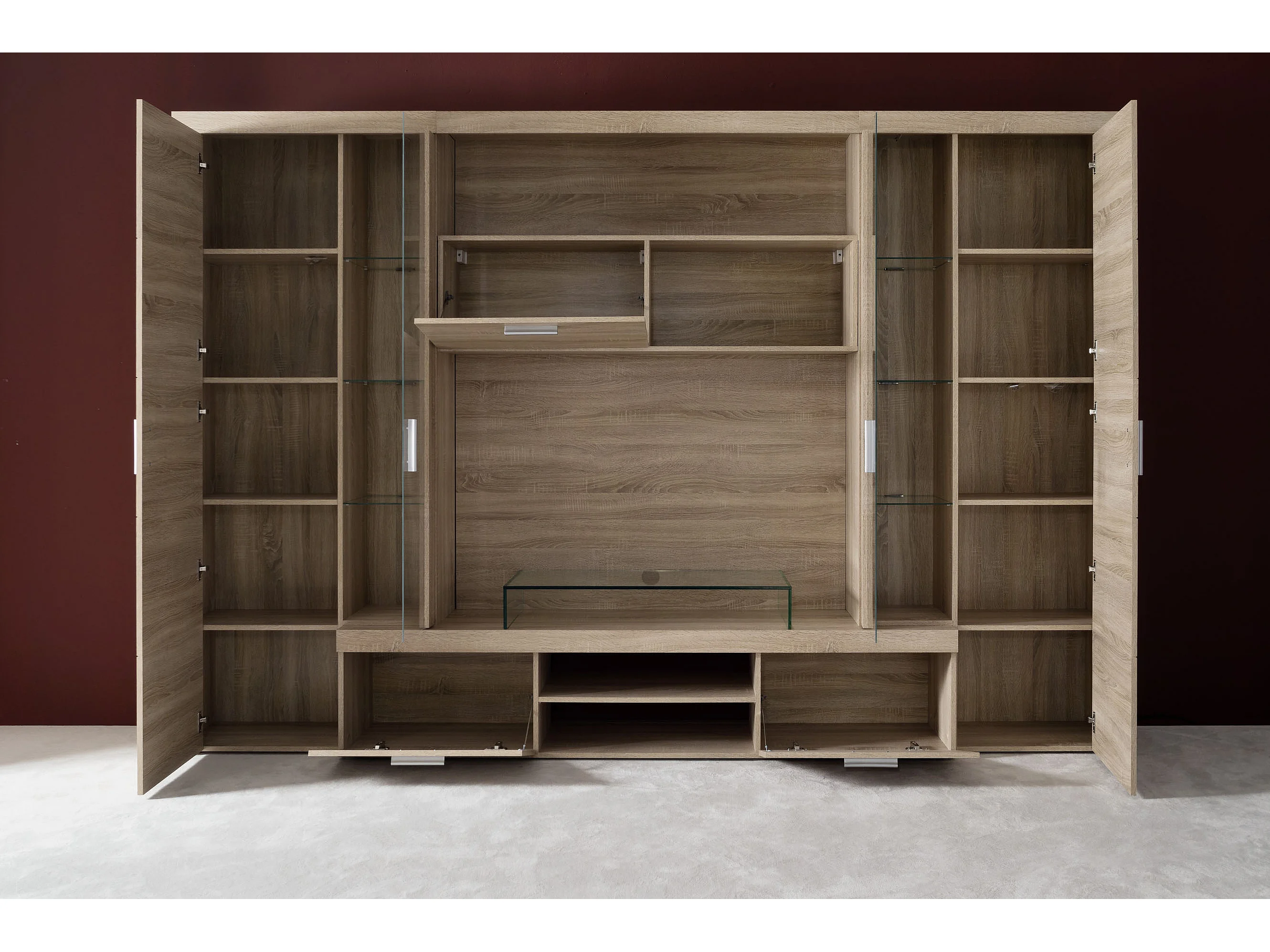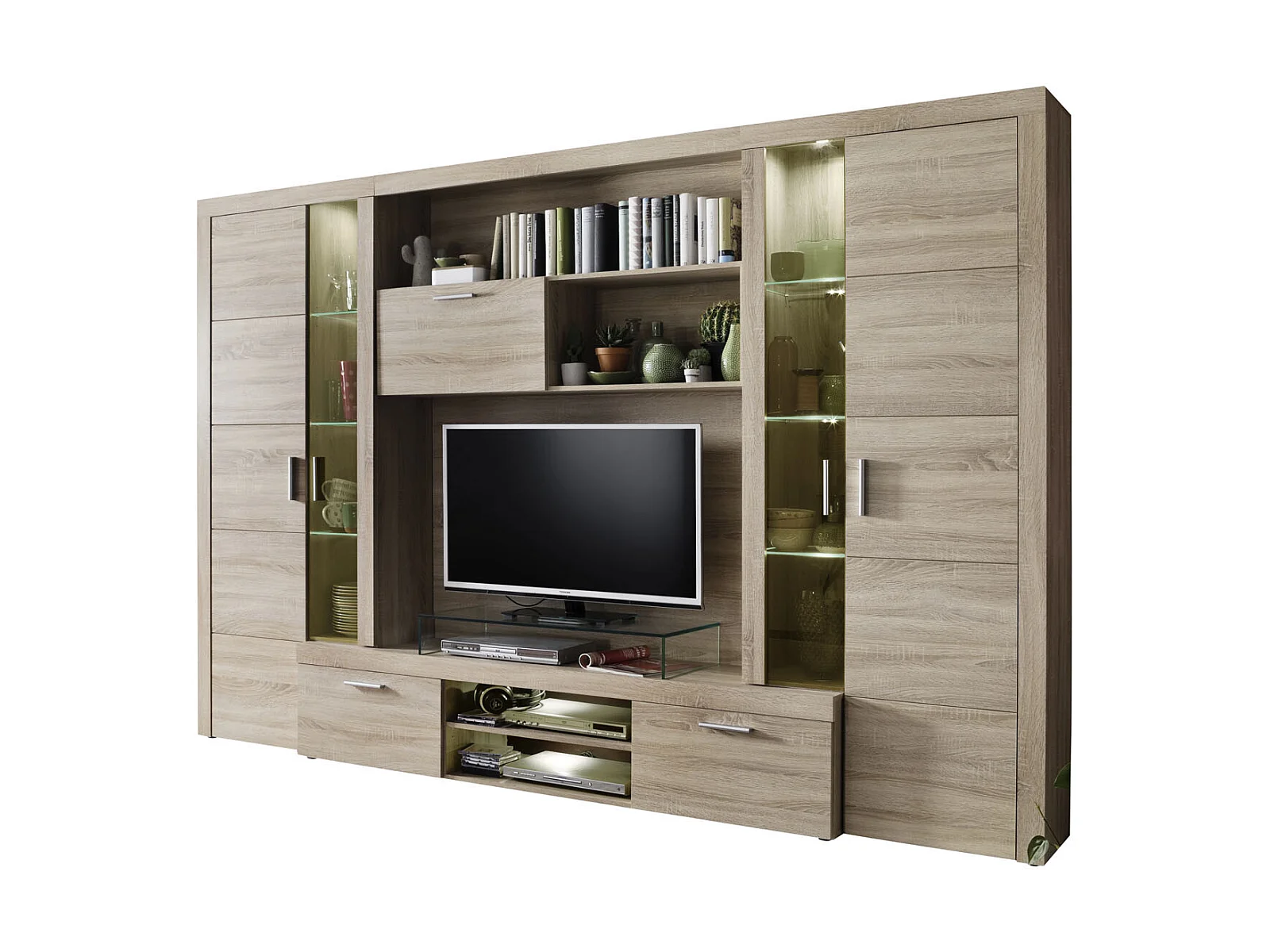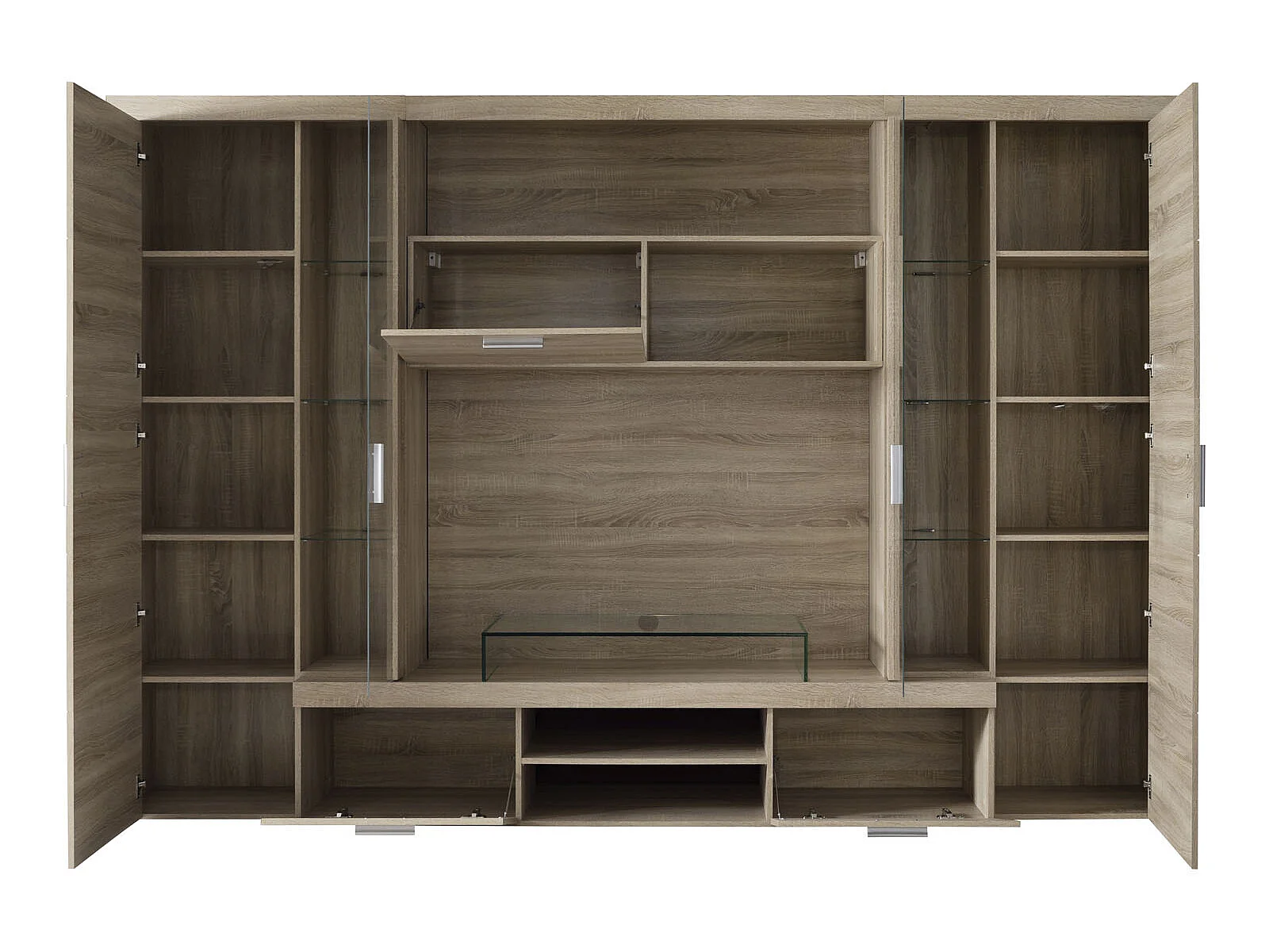 Molar Meuble de salon 4 portes, 5 tablettes de rangement et 3 portes pliantes, lumière incluse, finition chêne.