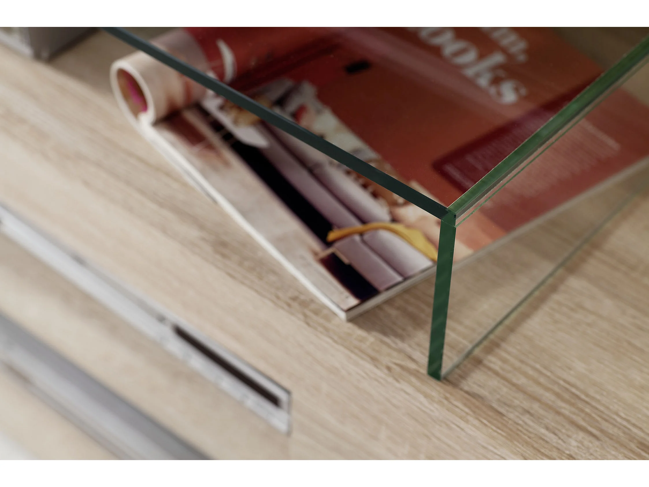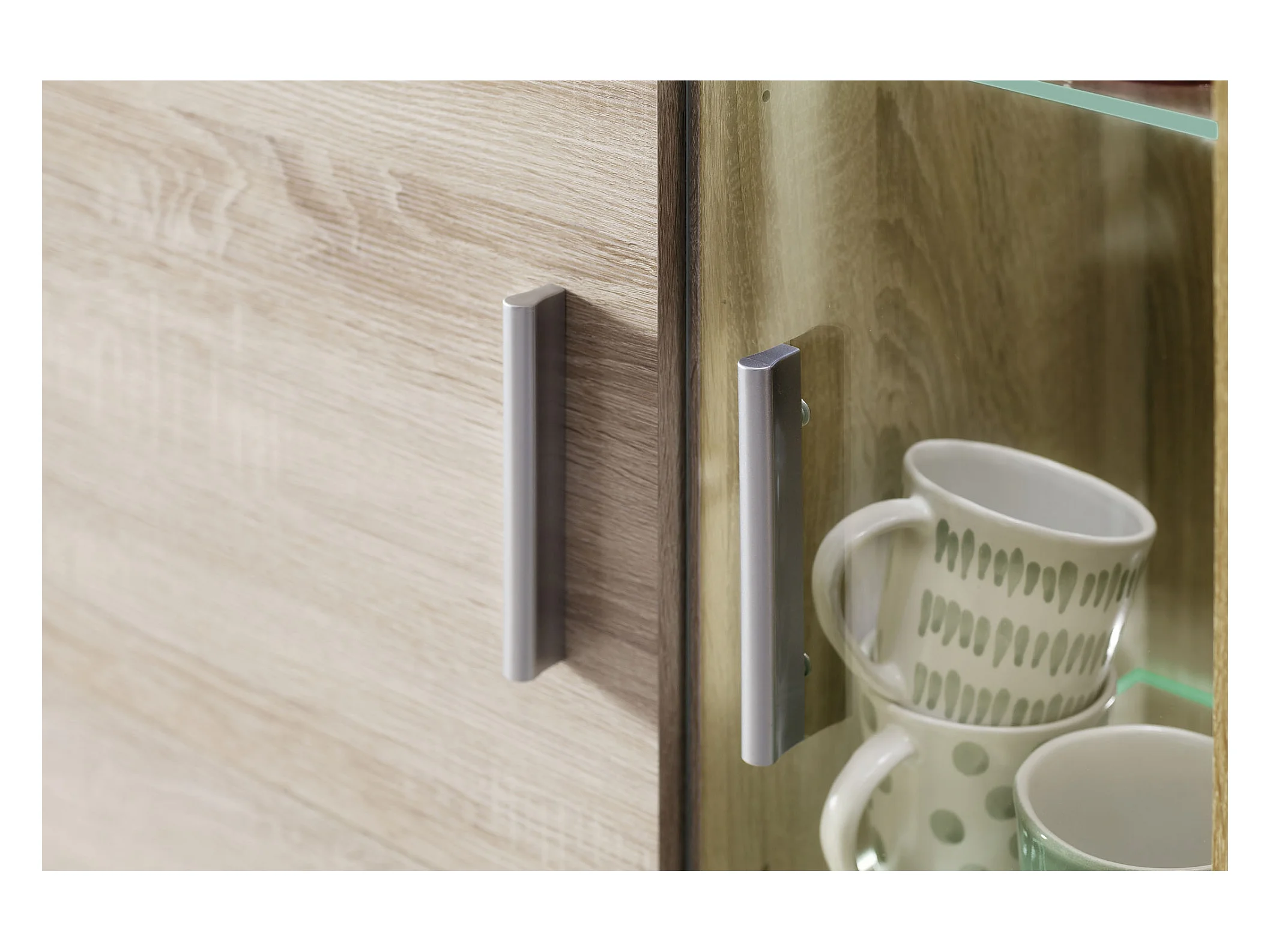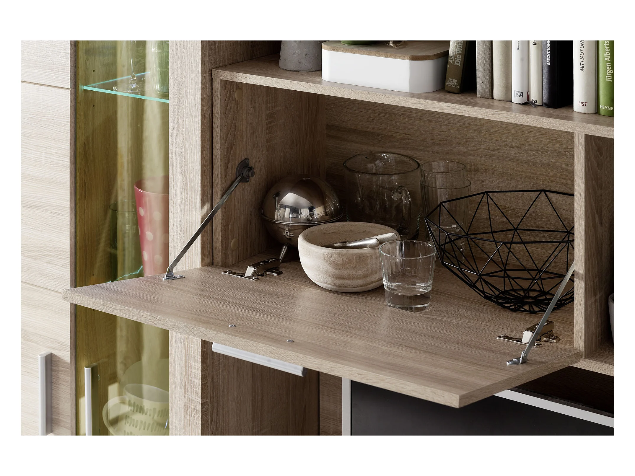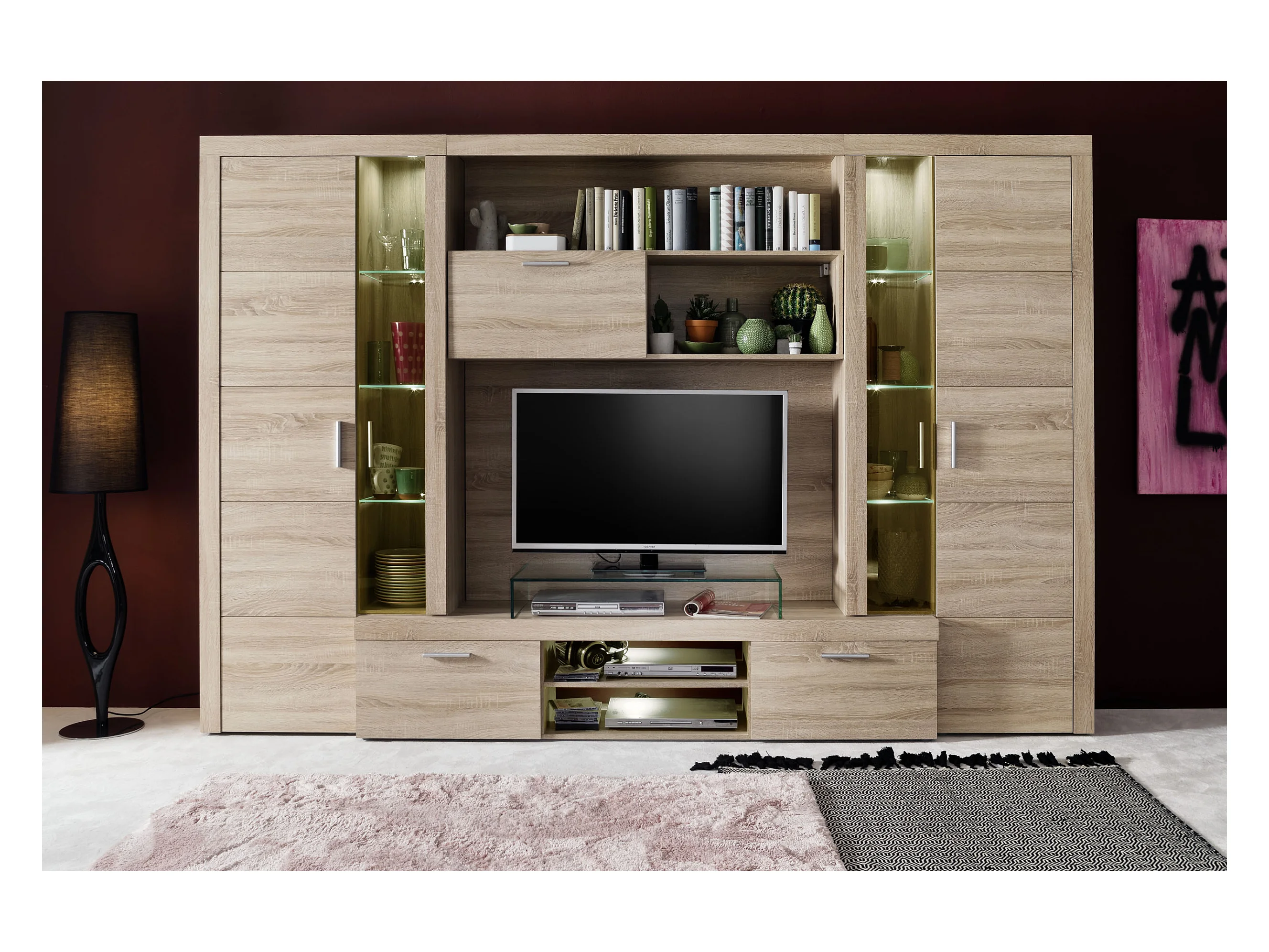 Molar Meuble de salon 4 portes, 5 tablettes de rangement et 3 portes pliantes, lumière incluse, finition chêne.