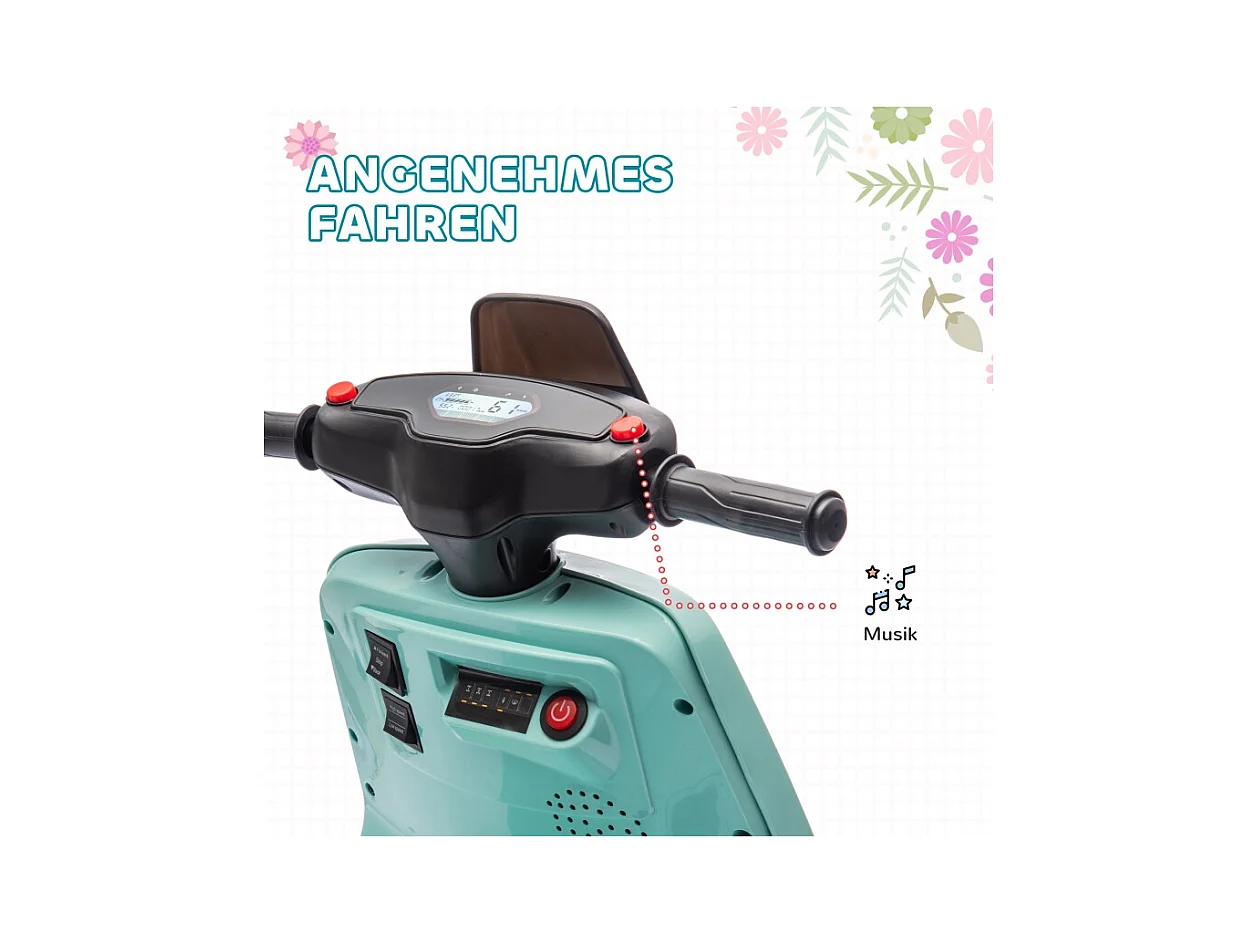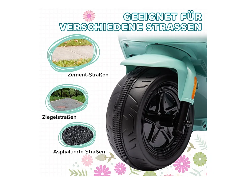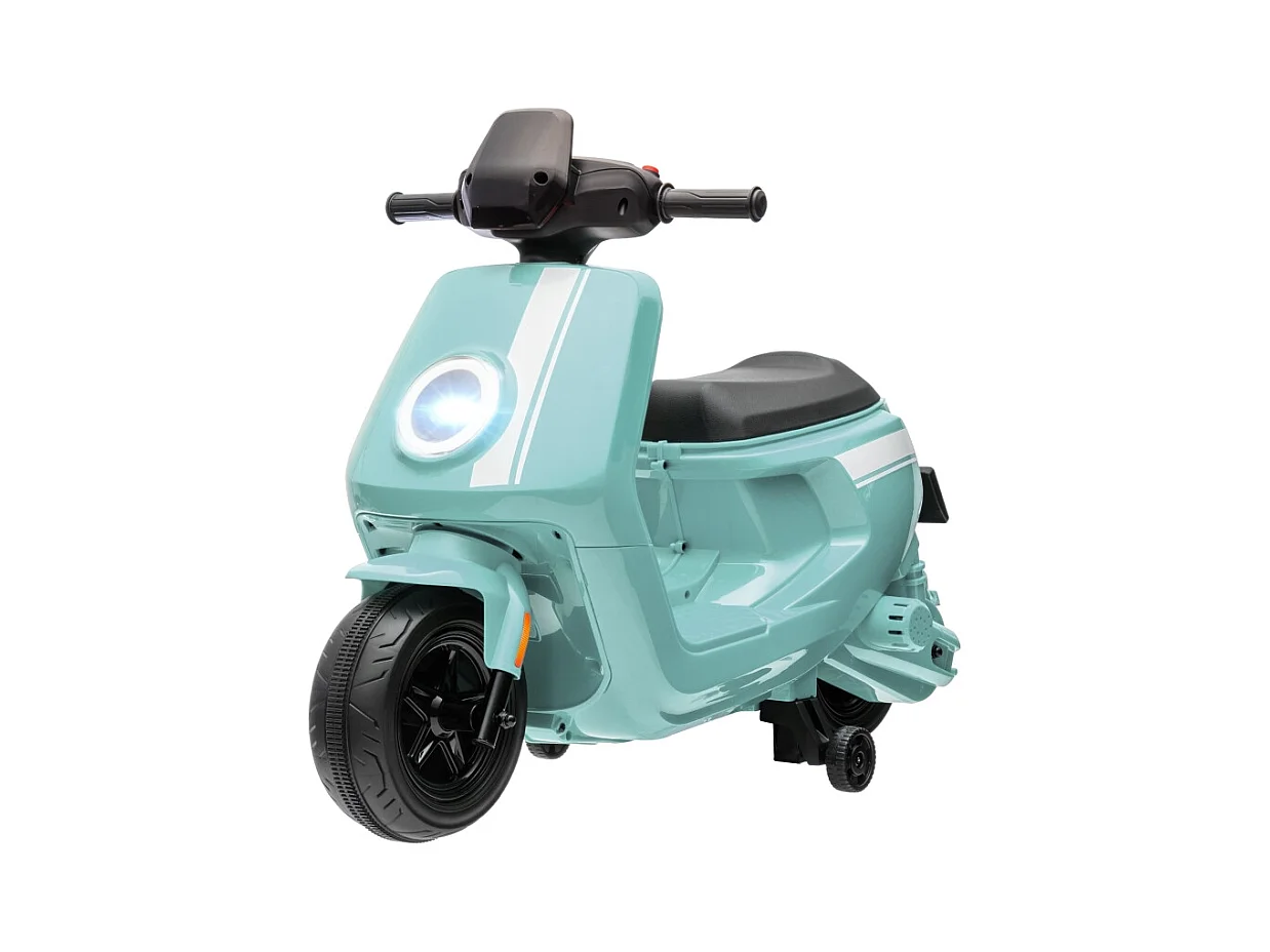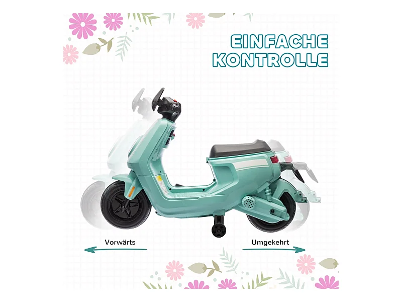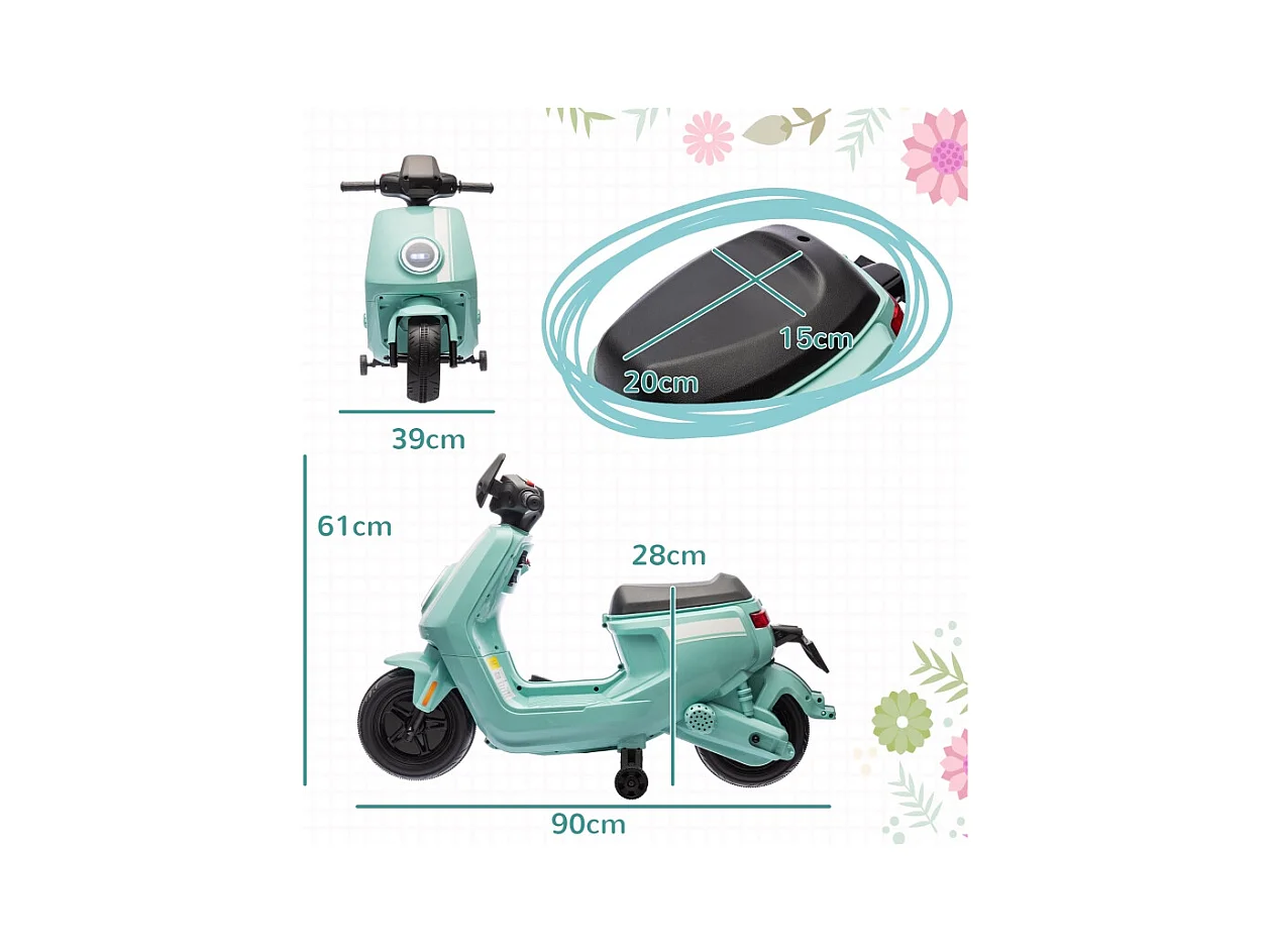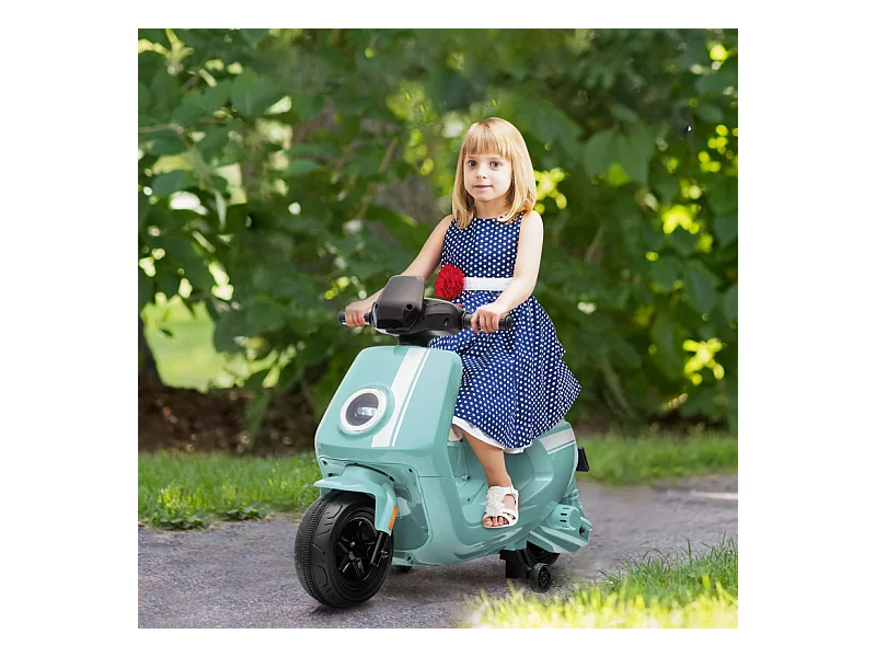Moto électrique pour enfants, avec phare et musique, marche avant/arrière, roues stabilisatrices, plastique, vert (90x39x61cm)