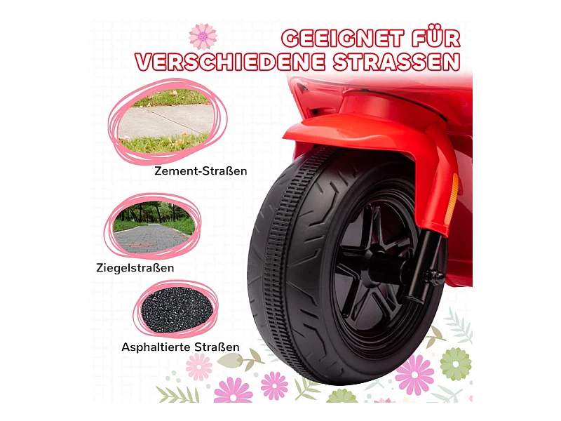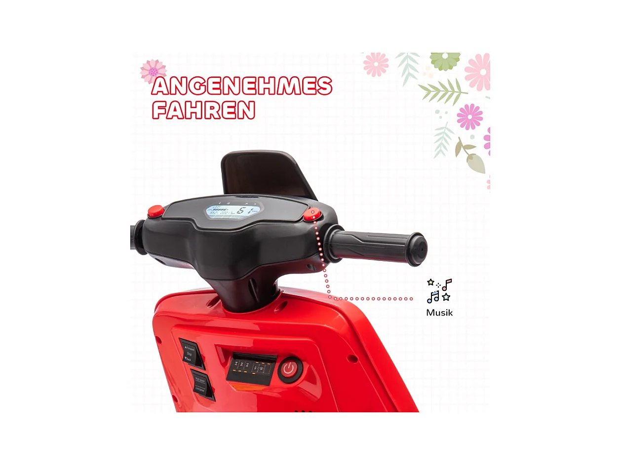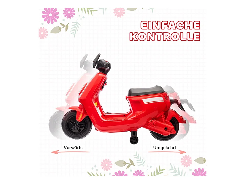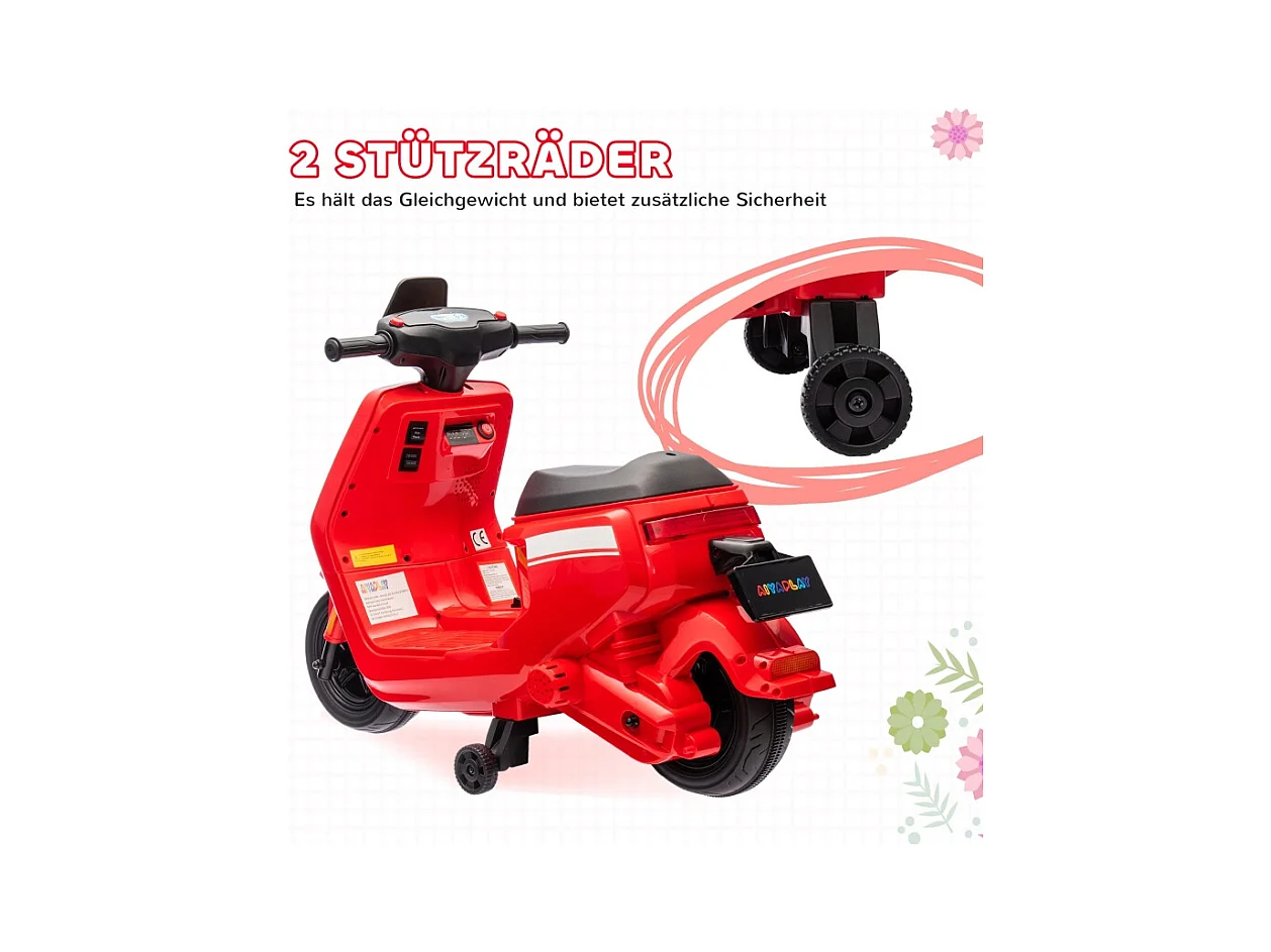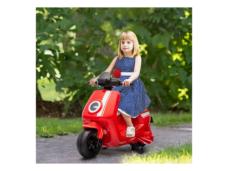 Moto électrique pour enfants, avec phare et musique, marche avant et arrière, roues stabilisatrices, plastique, rouge (90x39x61cm)