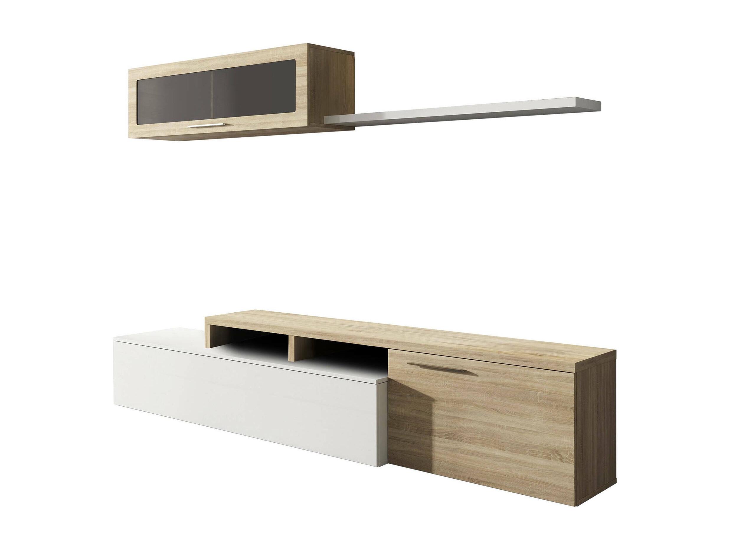 Système mural Dzuell, ensemble de salon meuble TV, meuble de salon polyvalent, 220x41h180 cm, Chêne noué et blanc