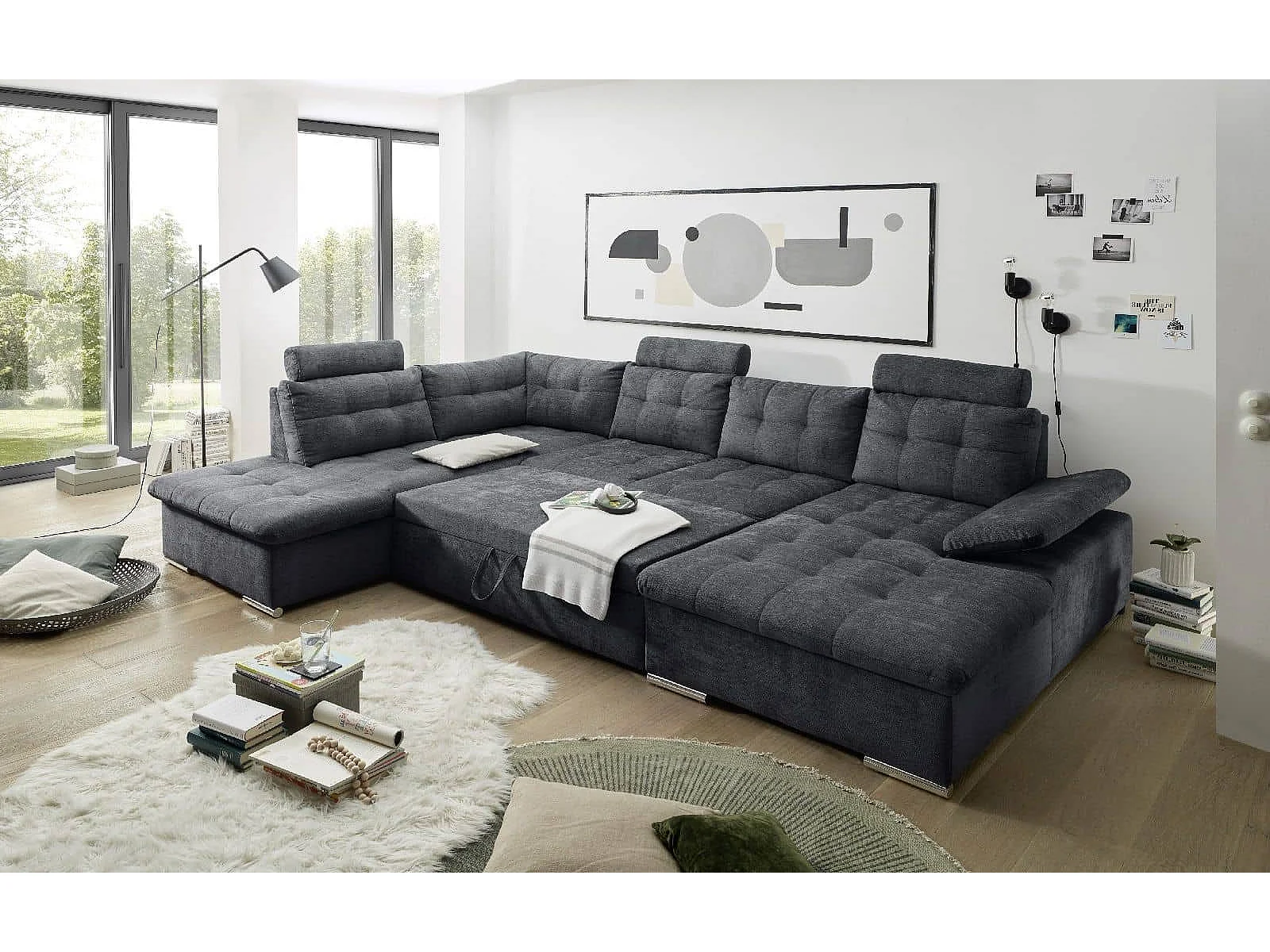 MYHOMELANDO Brest canapé panoramique – forme en U avec fonction couchage et coffre de rangement