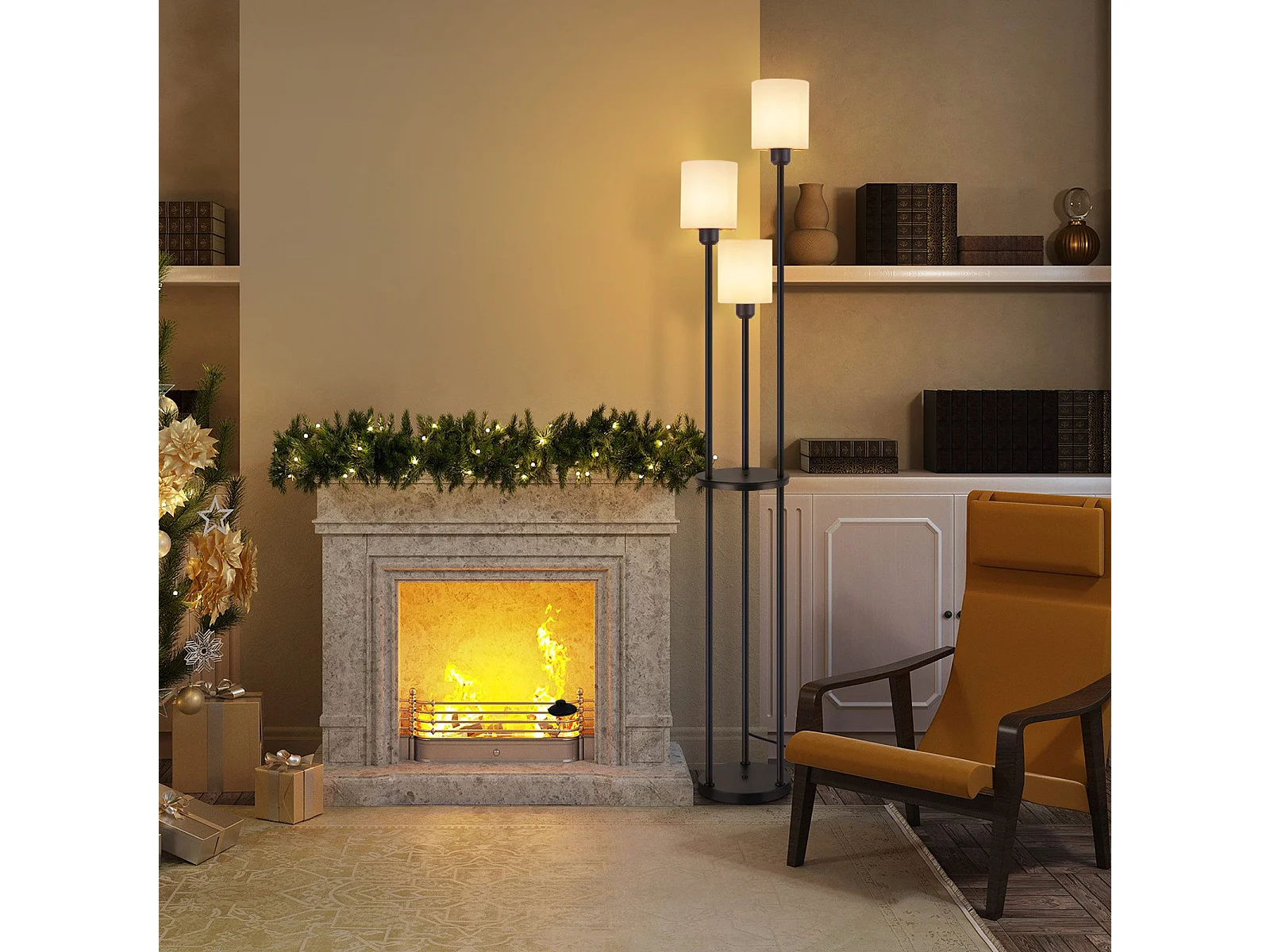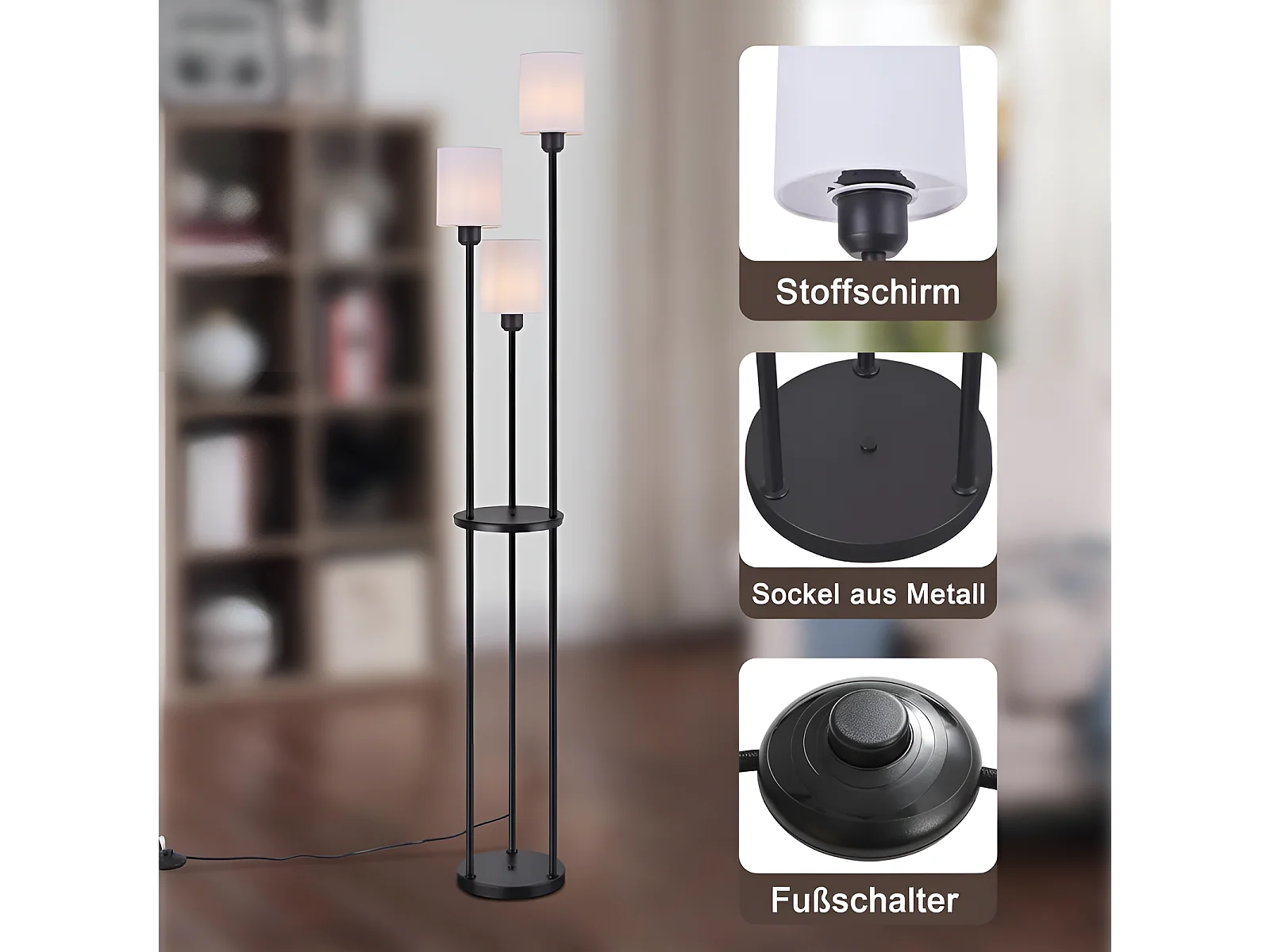 NETTLIFE Lampadaire salon E27 vintage 3 lampes abat-jour tissu interrupteur au pied