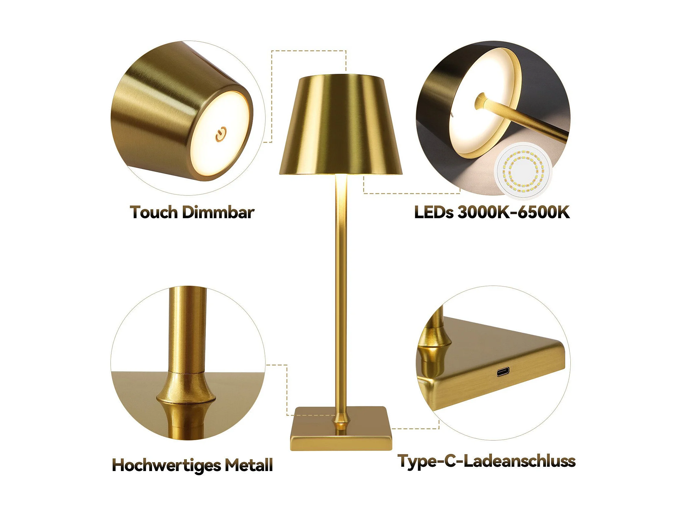 NETTLIFE Lampe de table LED vintage dorée sans fil tactile à intensité variable, lampe de chevet à 3 températures de couleur