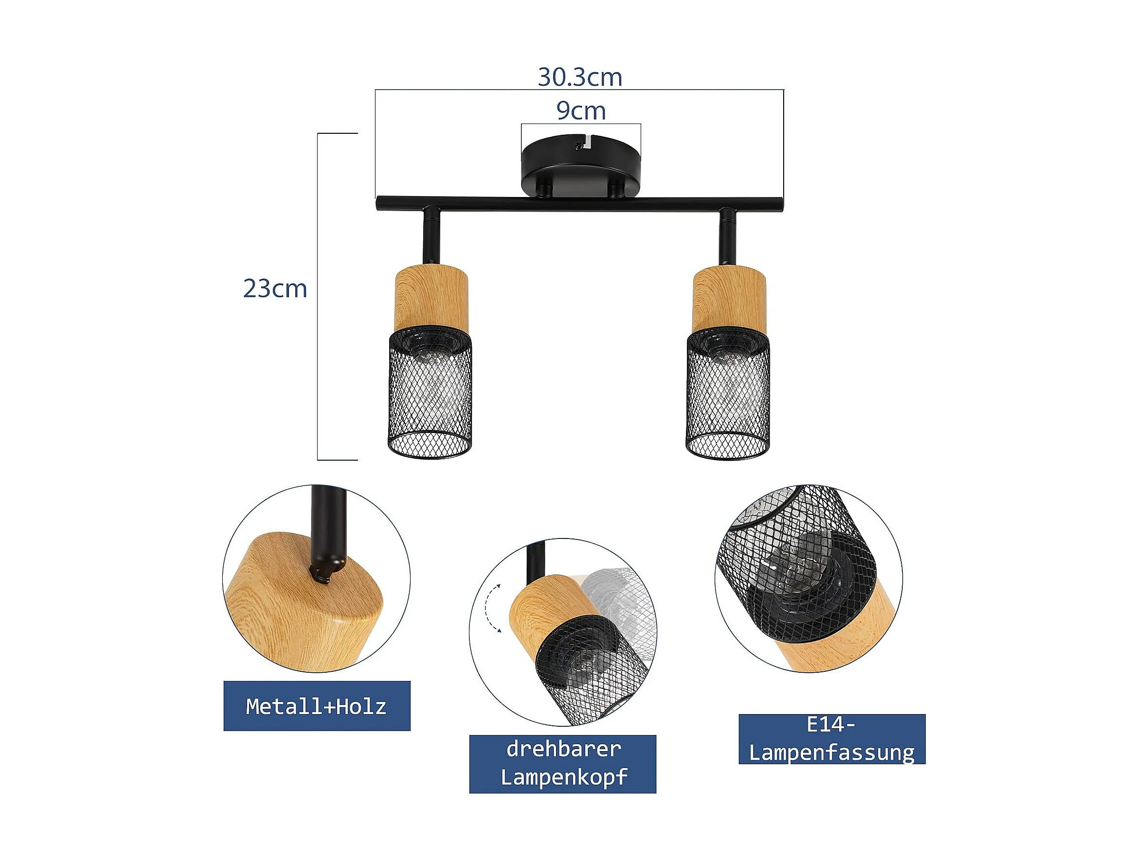 NETTLIFE Plafonnier 2 Ampoules spot de plafond vintage spots bois 350° orientables E14 rétro