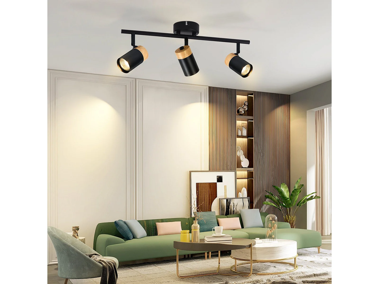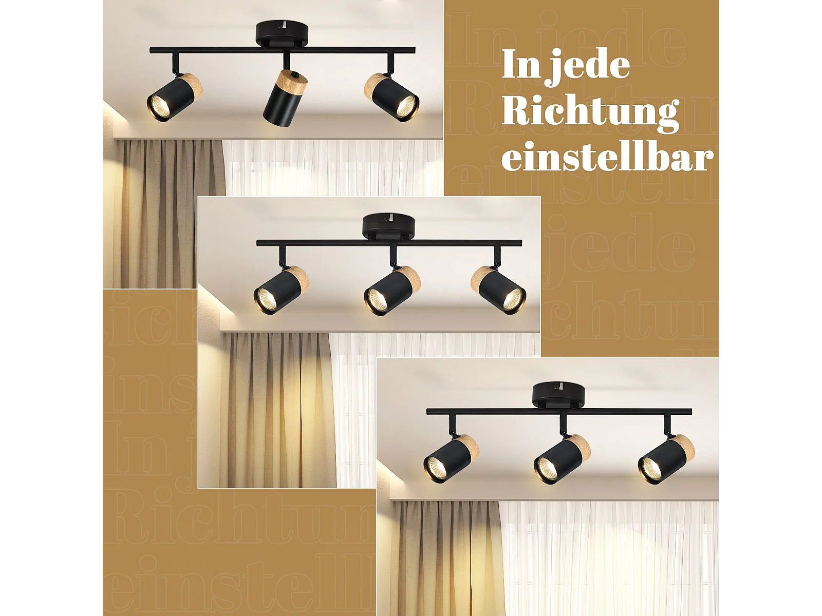 NETTLIFE Plafonnier 3 spots bois GU10 noir orientable 330° pour salon chambre cuisine chambre d'enfant sans ampoule