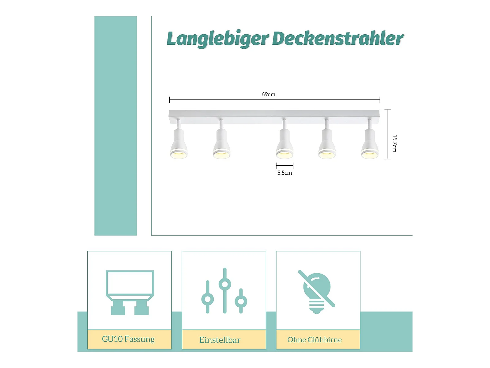 NETTLIFE Plafonnier Blanc moderne : 5 spots de plafond orientables en métal, plafonnier GU10, pour chambre, salle à manger, sans ampoule