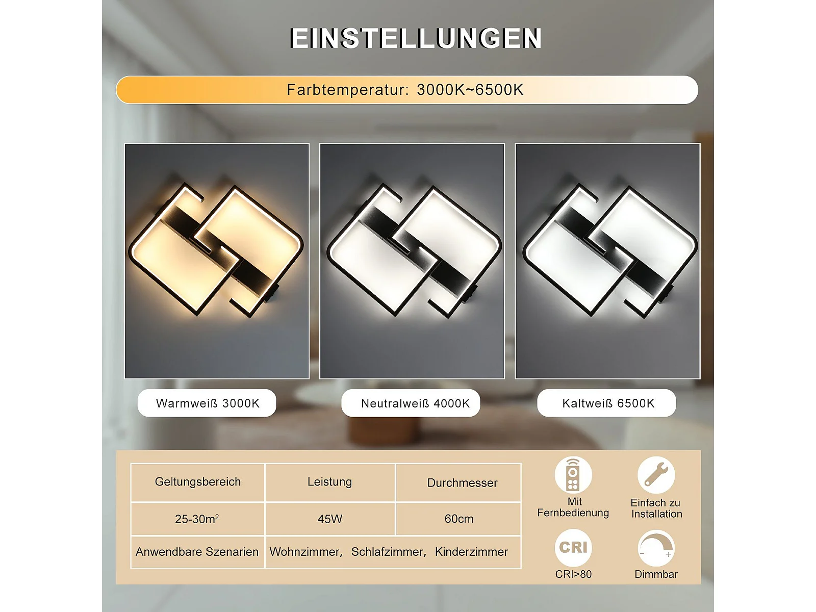 NETTLIFE Plafonnier LED Moderne 60 cm Noir 24 W Blanc Chaud Lampe de Salon pour Chambre Cuisine Couloir Salle à Manger