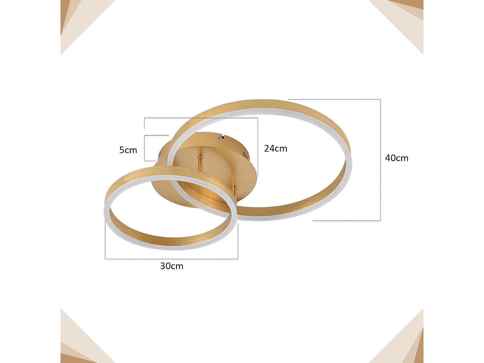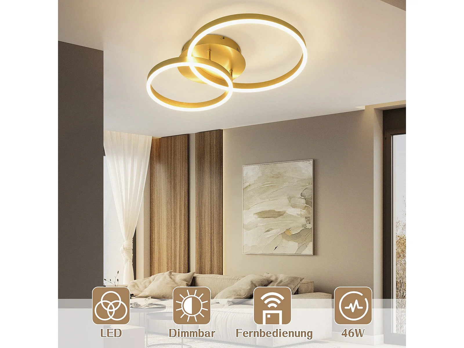 Plafonnier LED NETTLIFE doré à 2 anneaux en acrylique, 46 W, intensité variable, pour salon, moderne, 59 cm, avec télécommande
