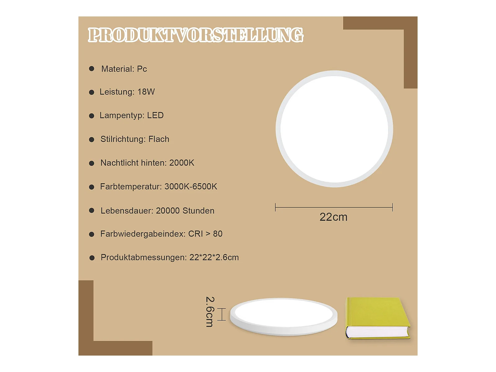 NETTLIFE Plafonnier LED Plat 22cm 18w à Intensité Variable Pour Chambre Cuisine 3000k - 6500k