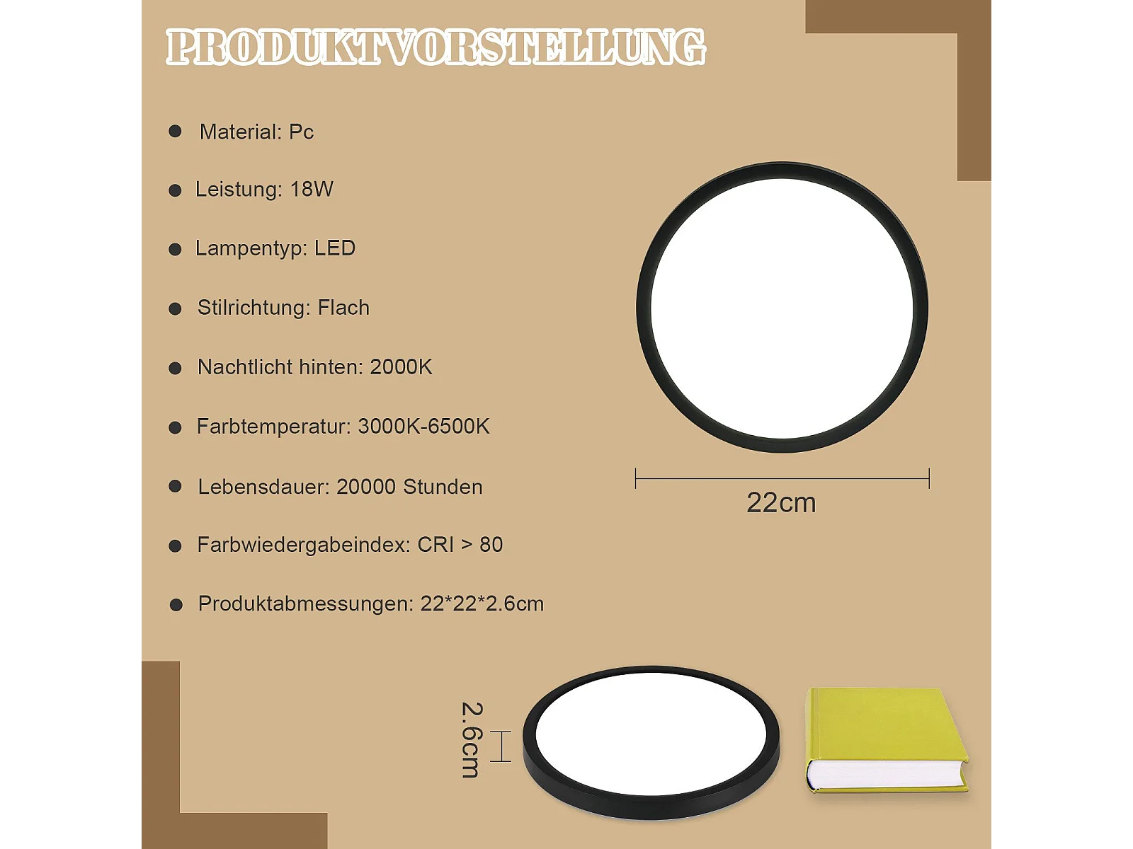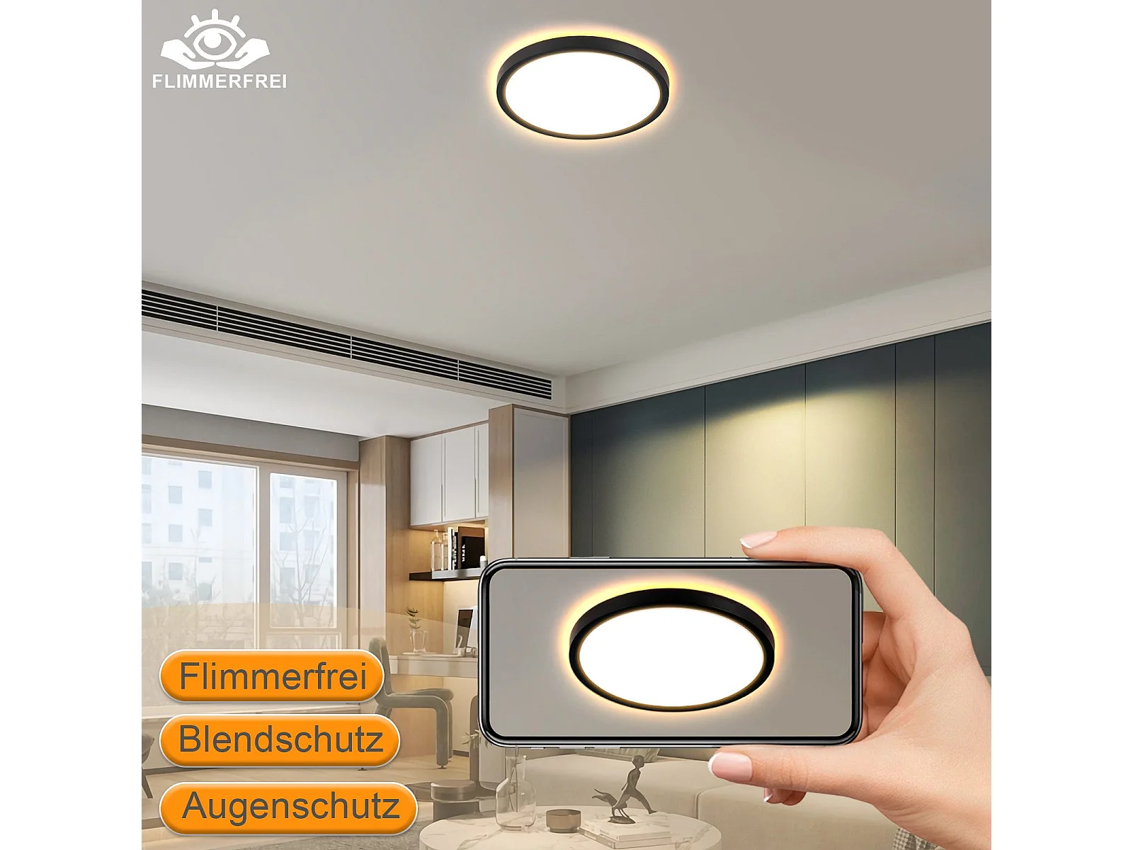 NETTLIFE Plafonnier LED Plat Noir 22cm 18w à Intensité Variable Pour Chambre à Coucher Cuisine 3000k - 6500k