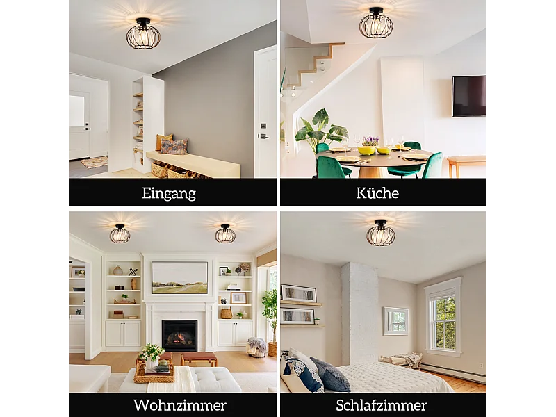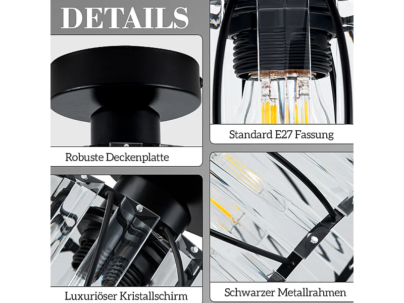 NETTLIFE Plafonnier Plafonnier moderne en cristal : Lampe de couloir noire E27 Lampe de cuisine vintage avec cadre en métal à l'intérieur