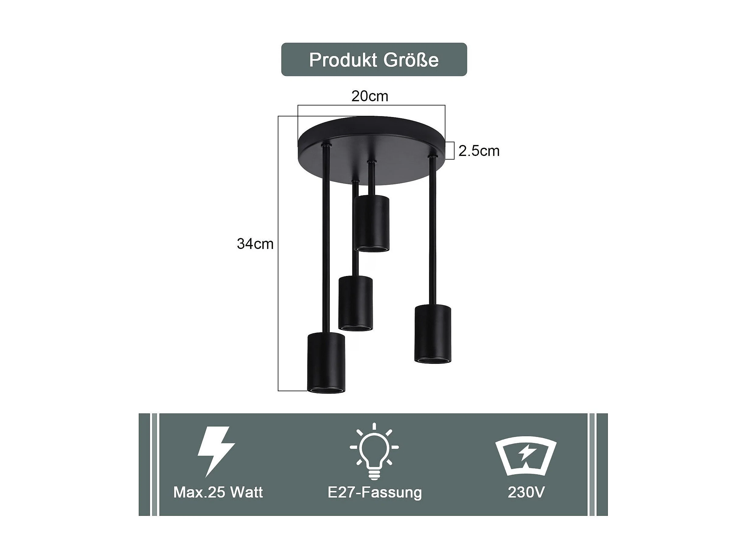 NETTLIFE Plafonnier plafonnier vintage noir 4 ampoules E27 rétro métal industriel Sans ampoules