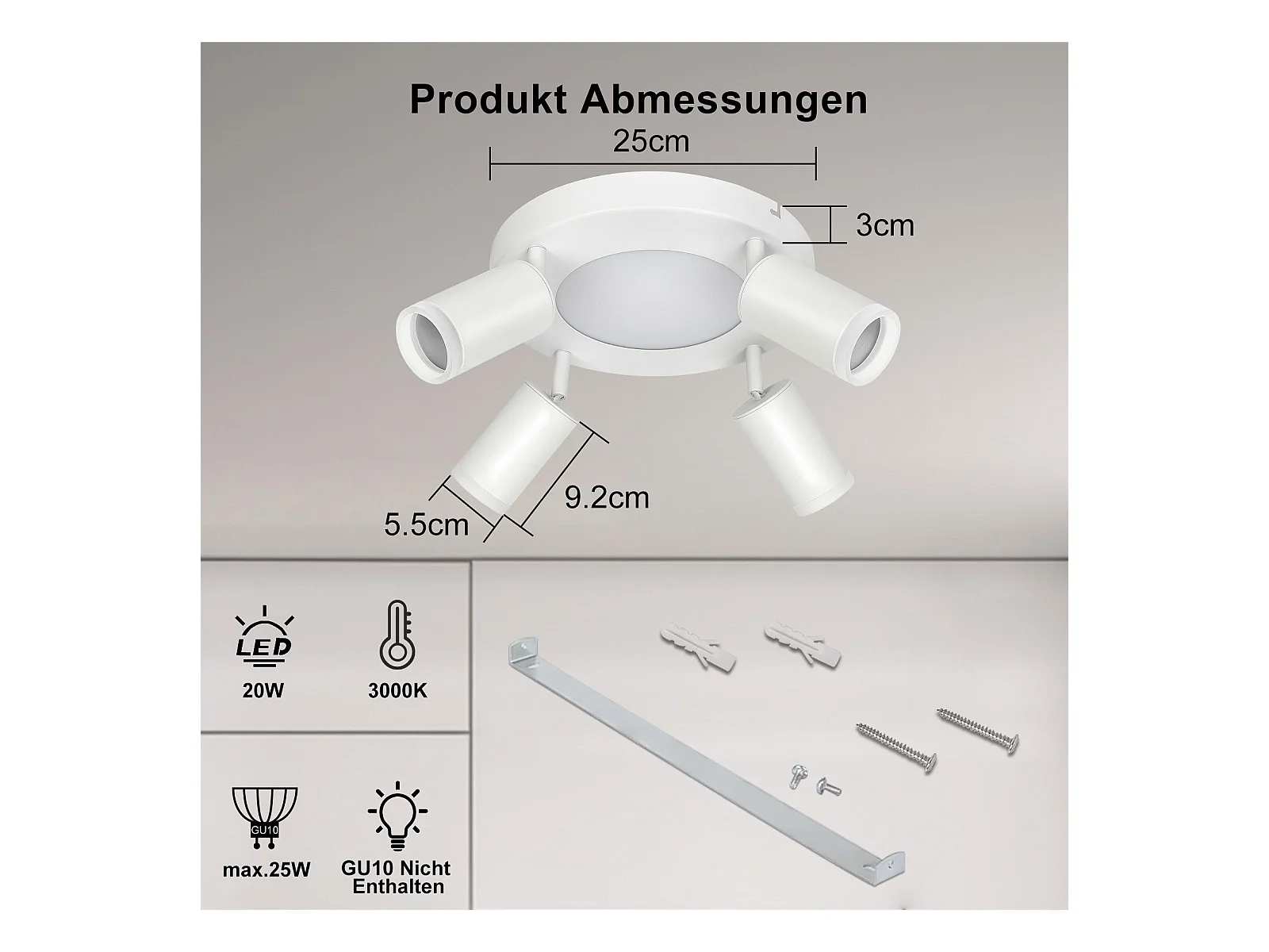 NETTLIFE Spot de plafond 4 ampoules rond 20W 3000K GU10 installation facile blanc chaud orientable 350° moderne