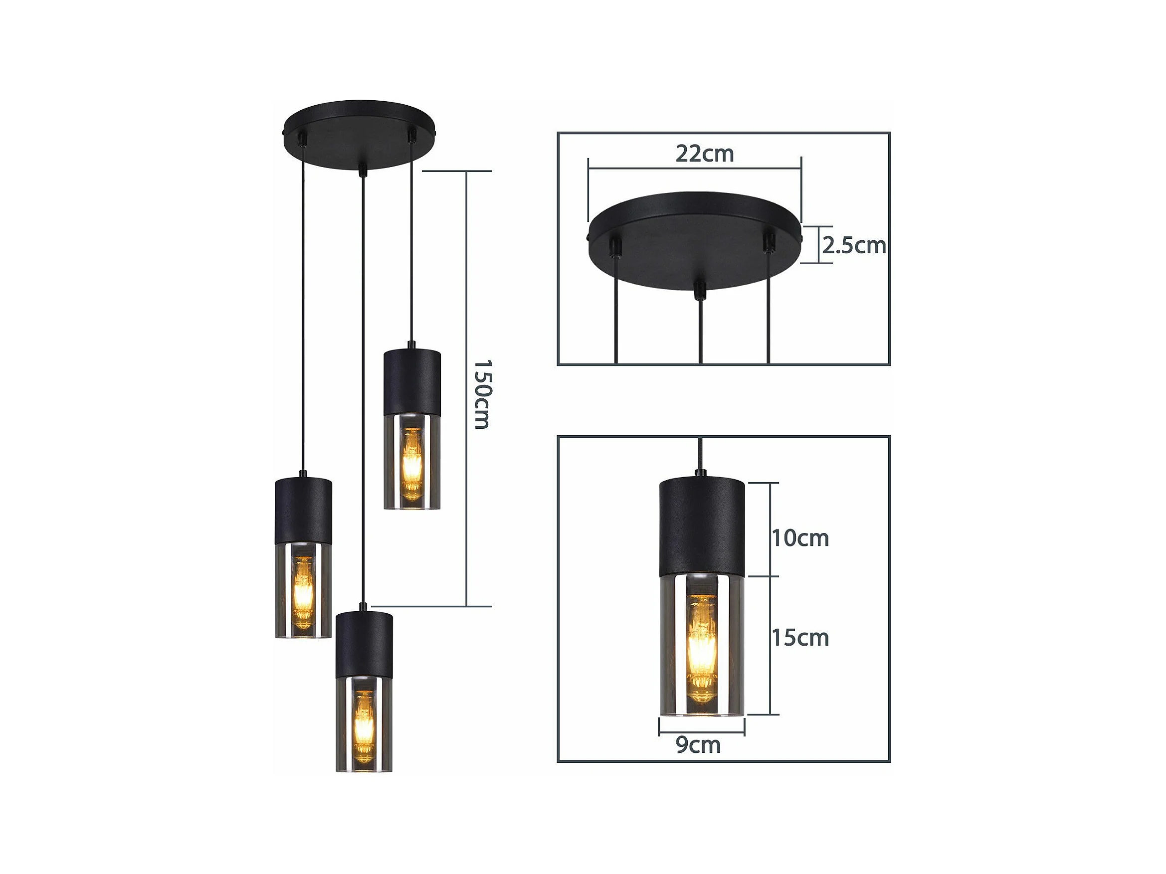 NETTLIFE Suspension 3 ampoules suspension verre E27 LED suspension ronde noire