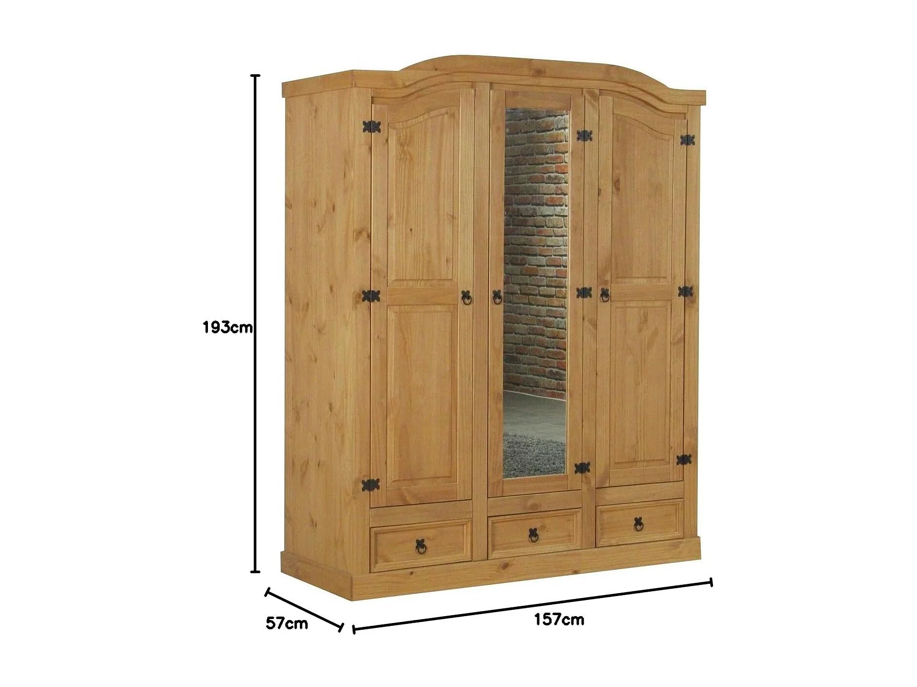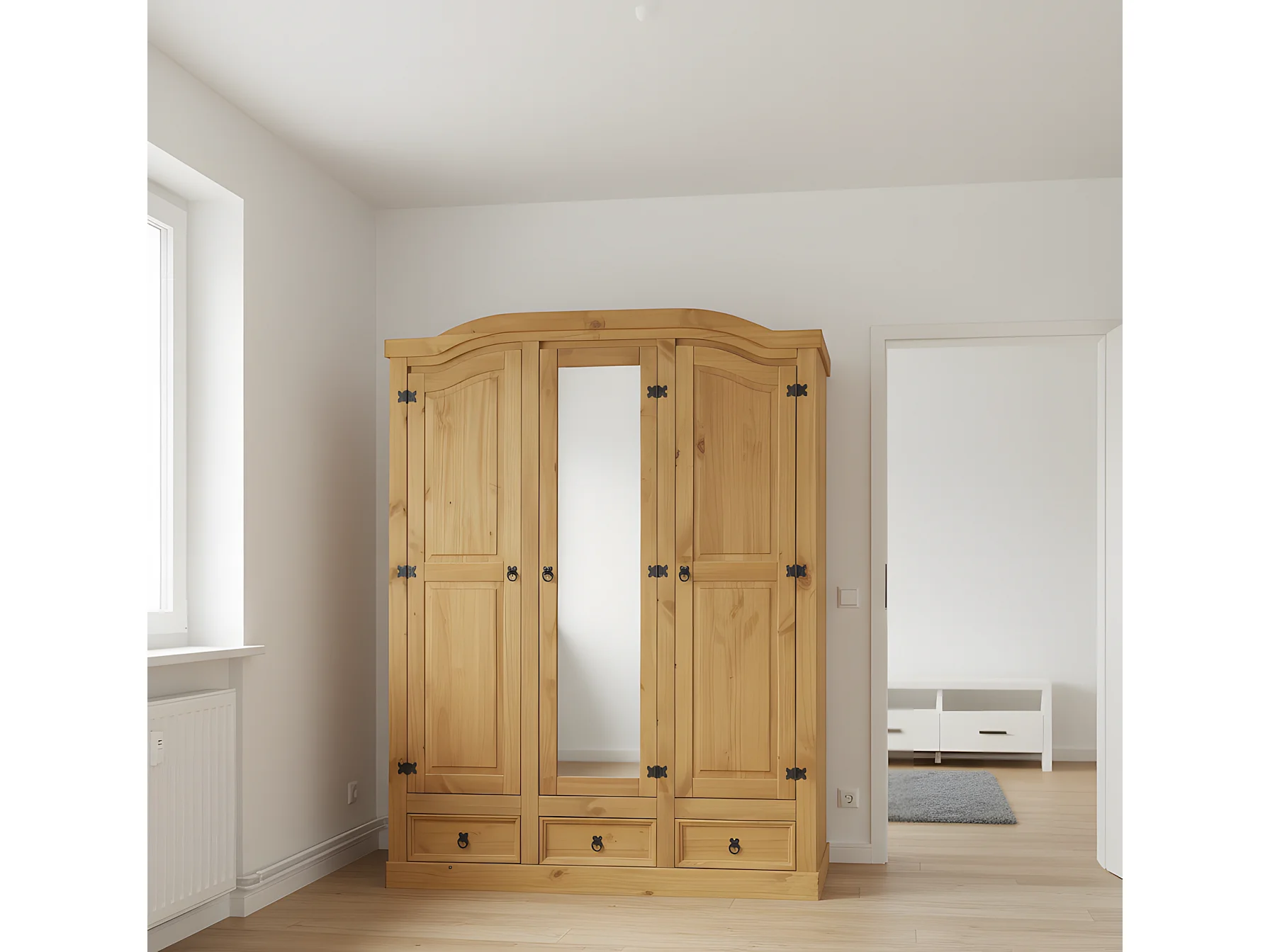 New Mexico Armoire 3 portes avec une porte miroir, 2 portes lambrissées et 3 tiroirs délavés, cirés.