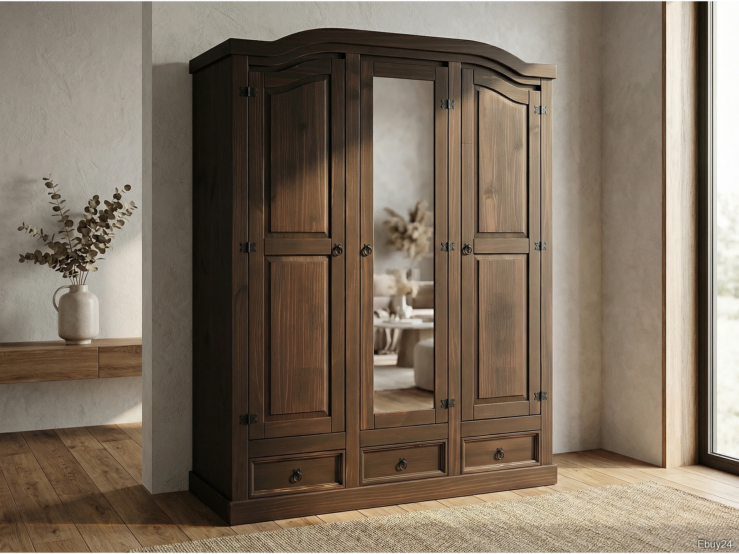 New Mexico Armoire 3 portes avec une porte miroir, 2 portes lambrissées et 3 tiroirs, finition ciré en style colonial.