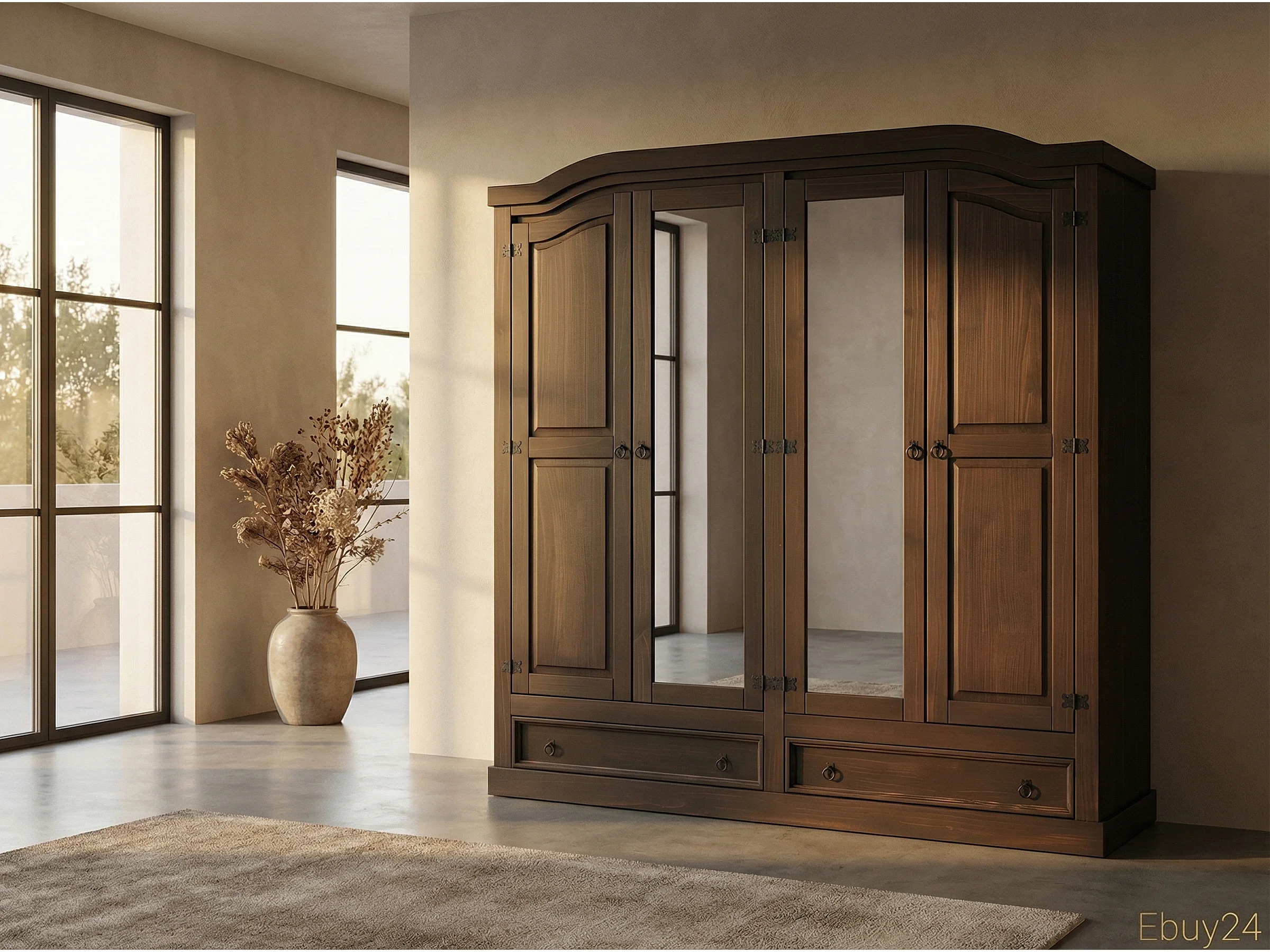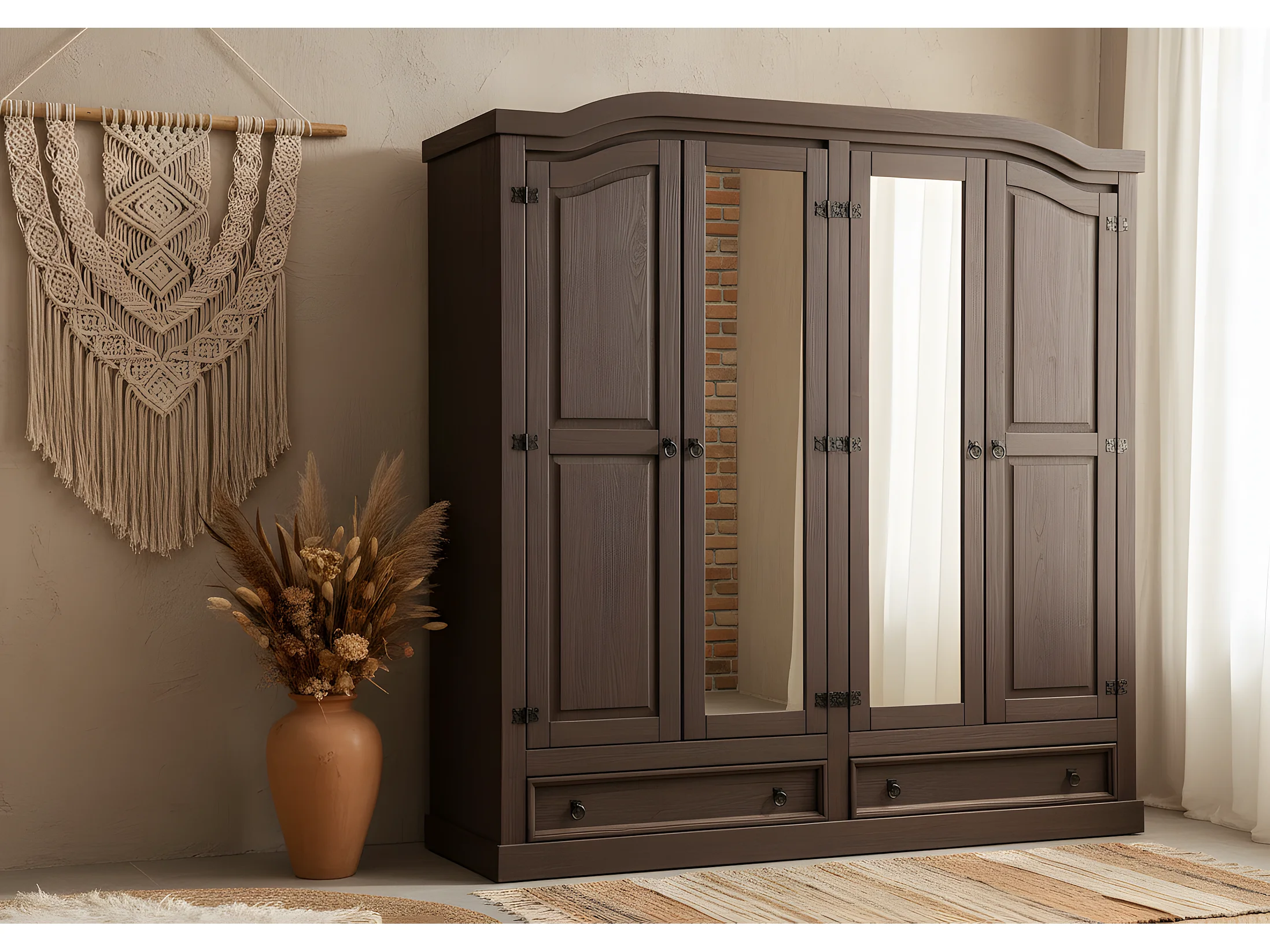 New Mexico Armoire 4 portes avec 2 portes miroir, 2 portes pleines et 2 tiroirs, largeur 194 cm, hauteur 193 cm, finition style colonial.