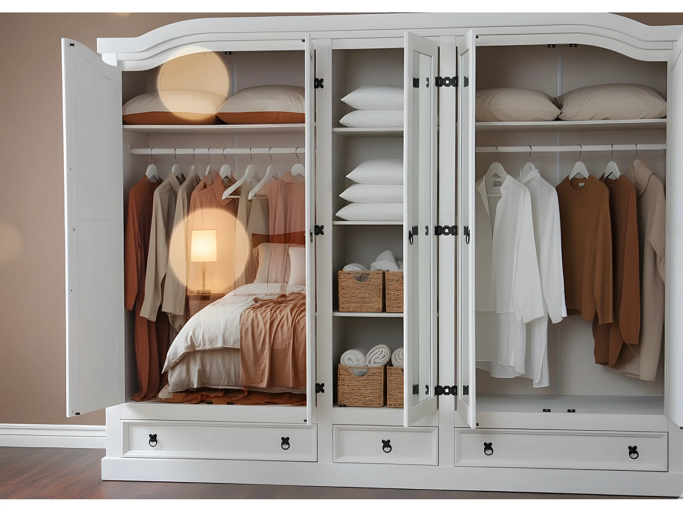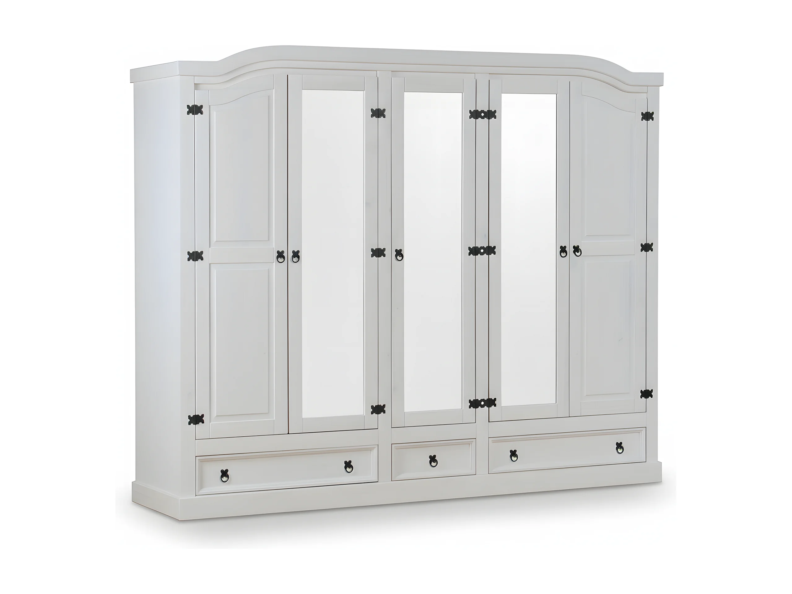 New Mexico Armoire 5 portes avec 3 portes miroirs, 2 portes lambrissées et 3 tiroirs en blanc ciré.