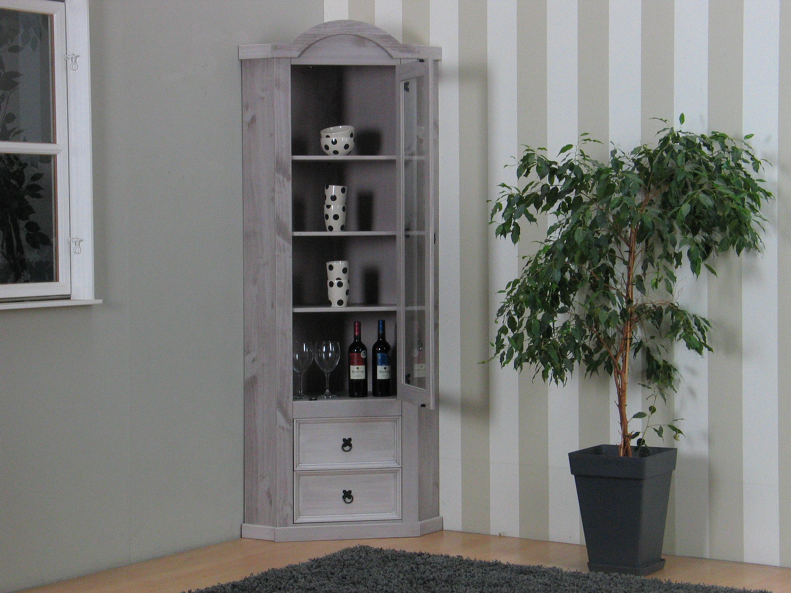 New Mexico Armoire d'angle Mexico avec 1 porte vitrée et 2 tiroirs, en gris.