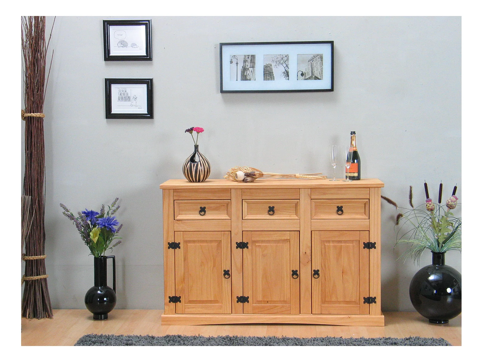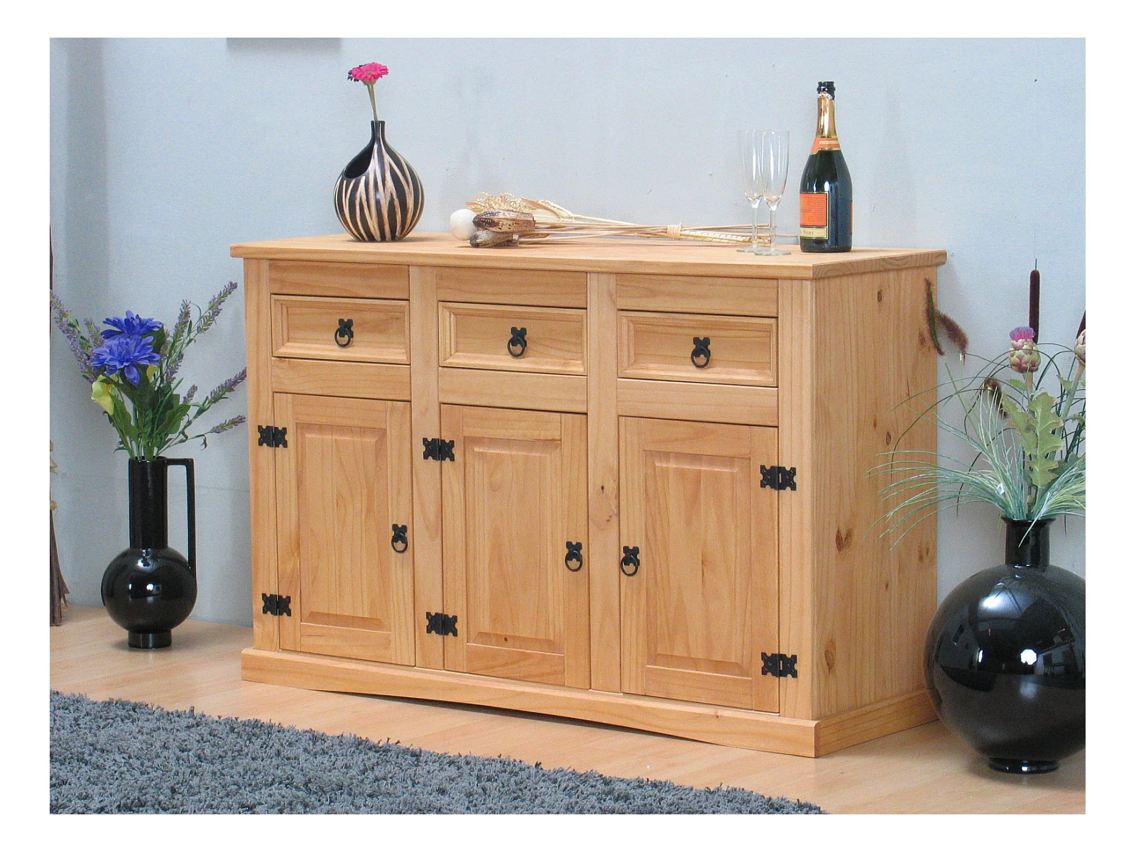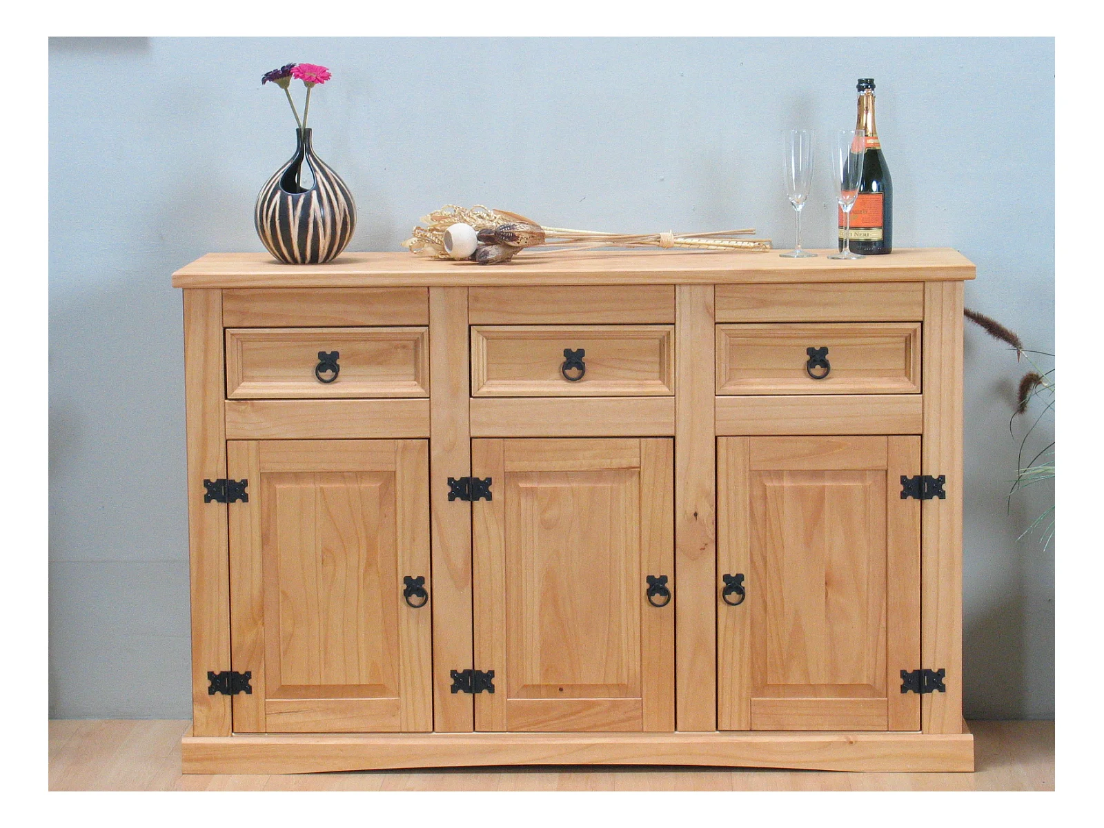 New Mexico Buffet, avec 3 tiroirs et 3 portes, largeur 132 cm, hauteur 84 cm, teinte/cire dans un style colonial.