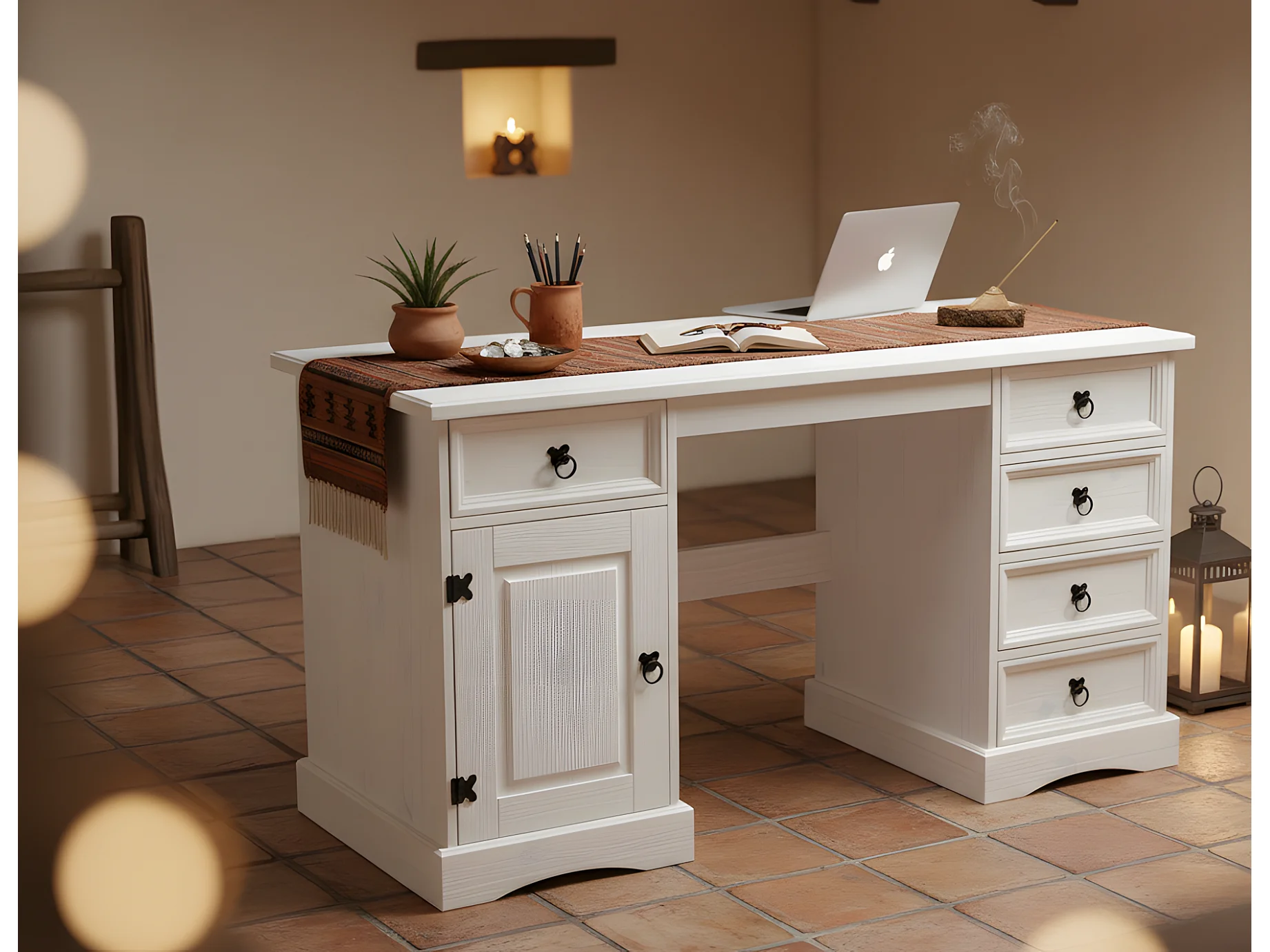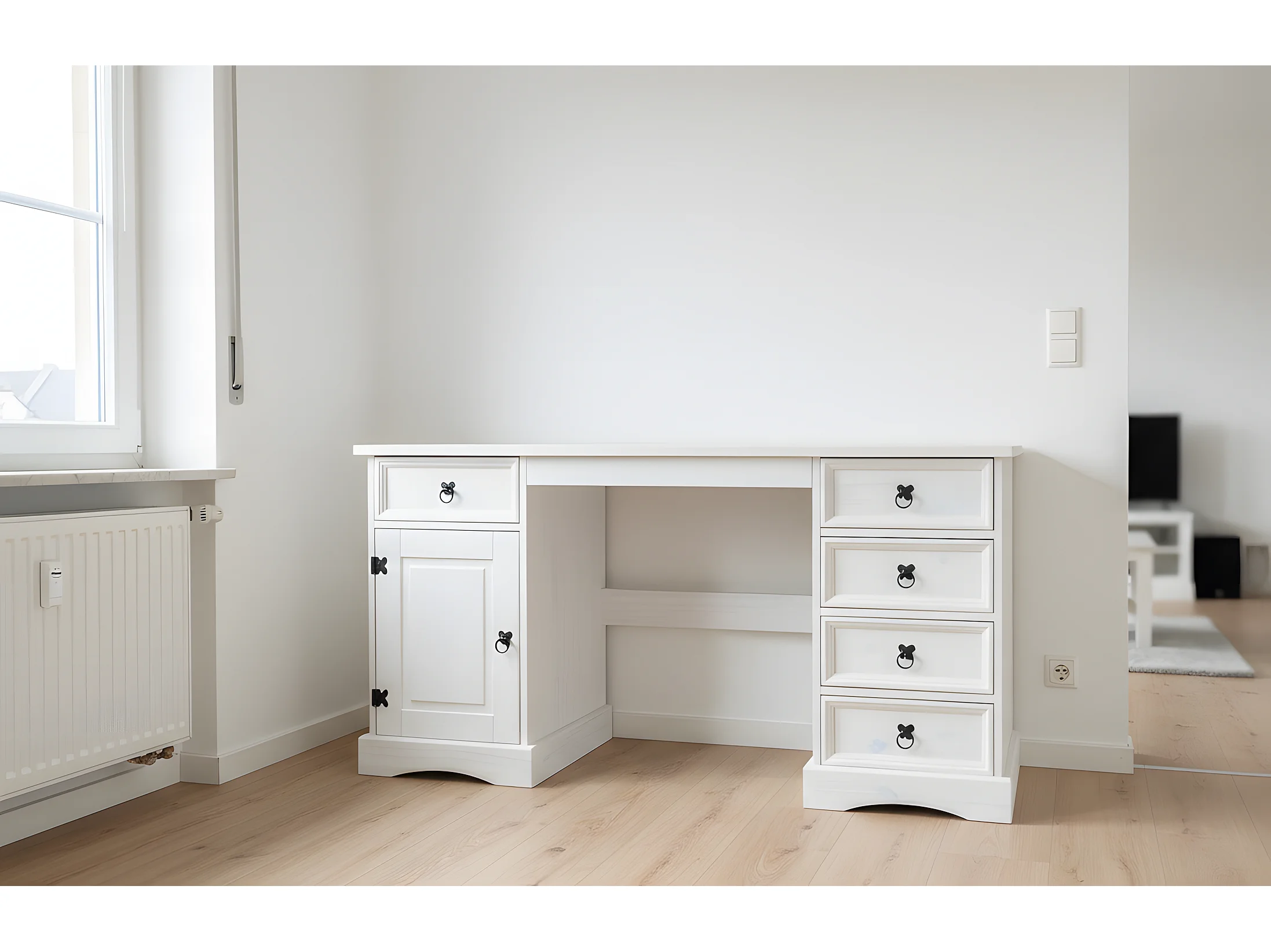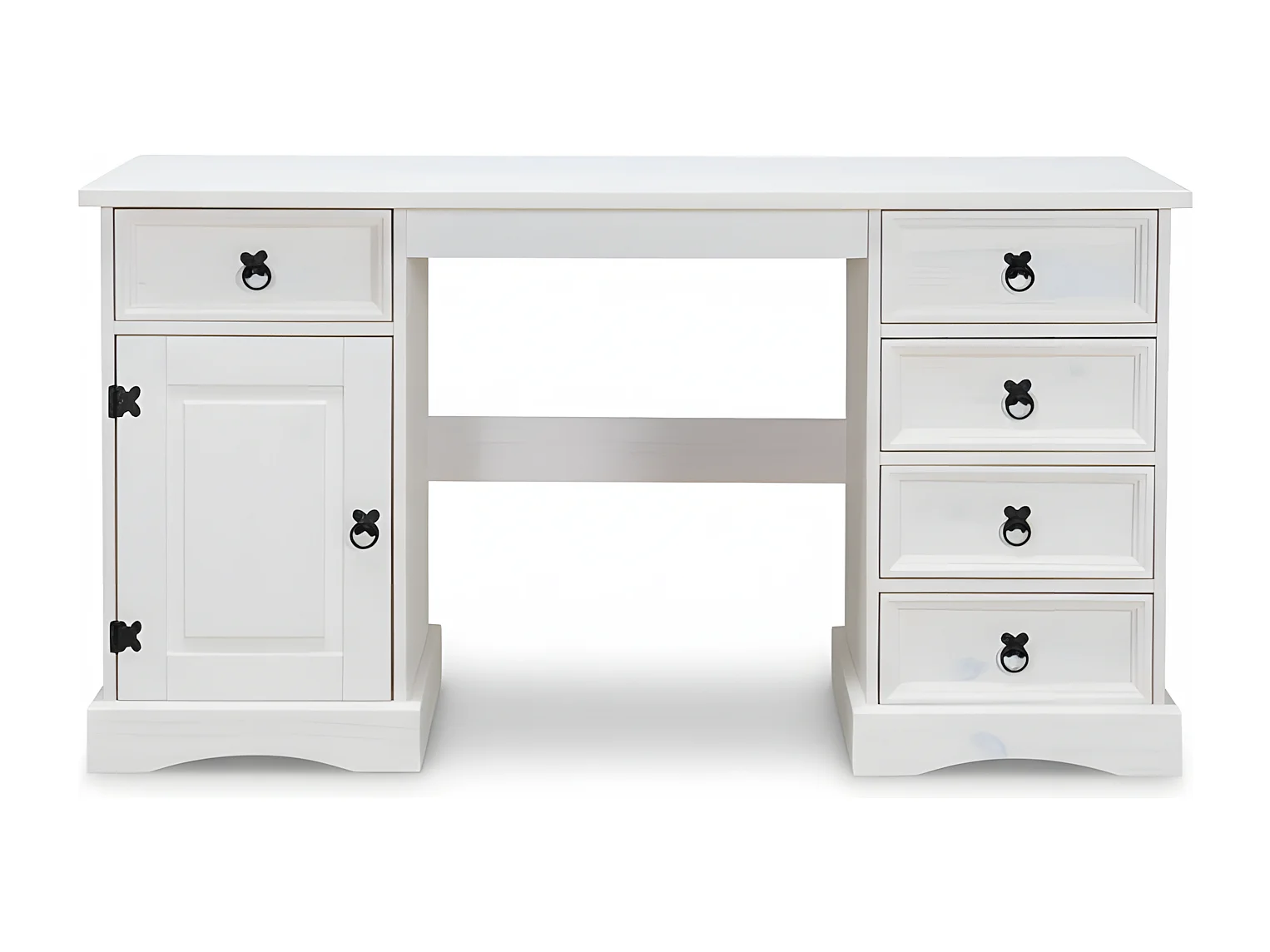 New Mexico Bureau, largeur 141 cm, hauteur 76 cm avec 5 tiroirs et 1 porte, blanc/ciré.