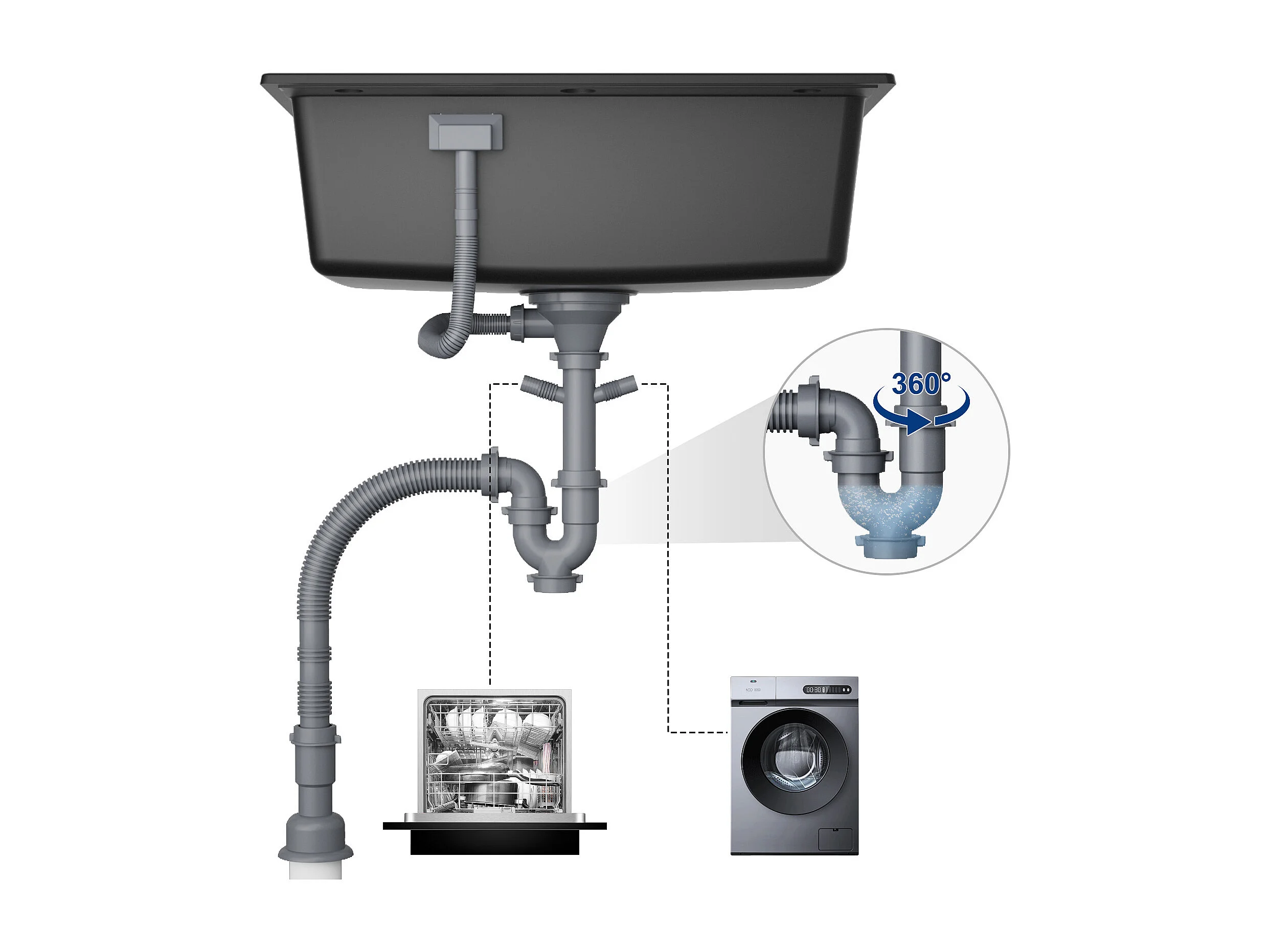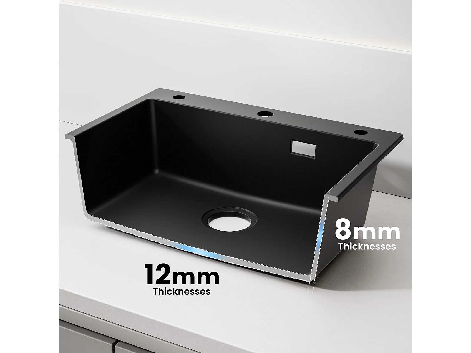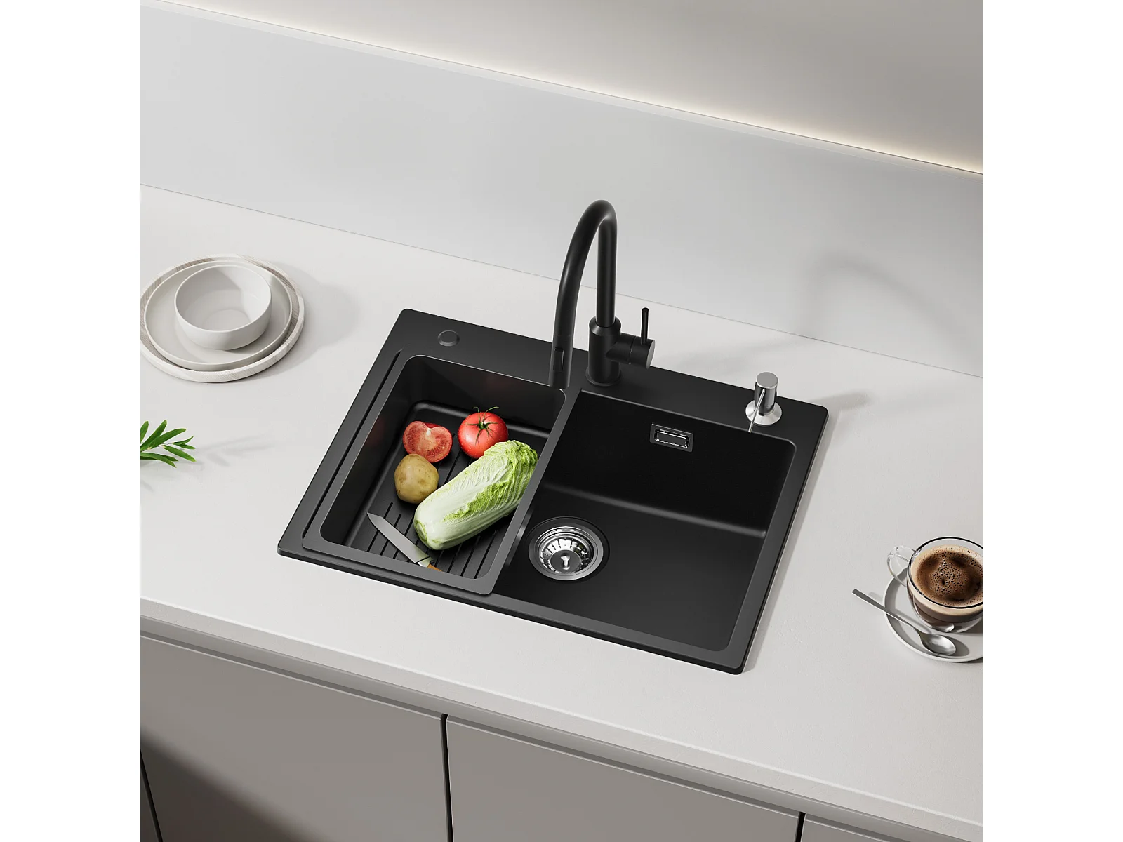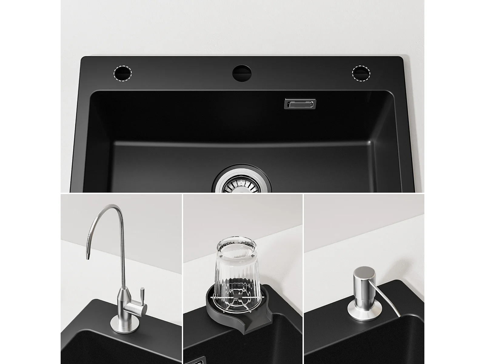 Noir Evier en Quartz avec Panier de Vidange et Distributeur de Savon 60*45cm + Mitigeur de Cuisine en Inox Noir