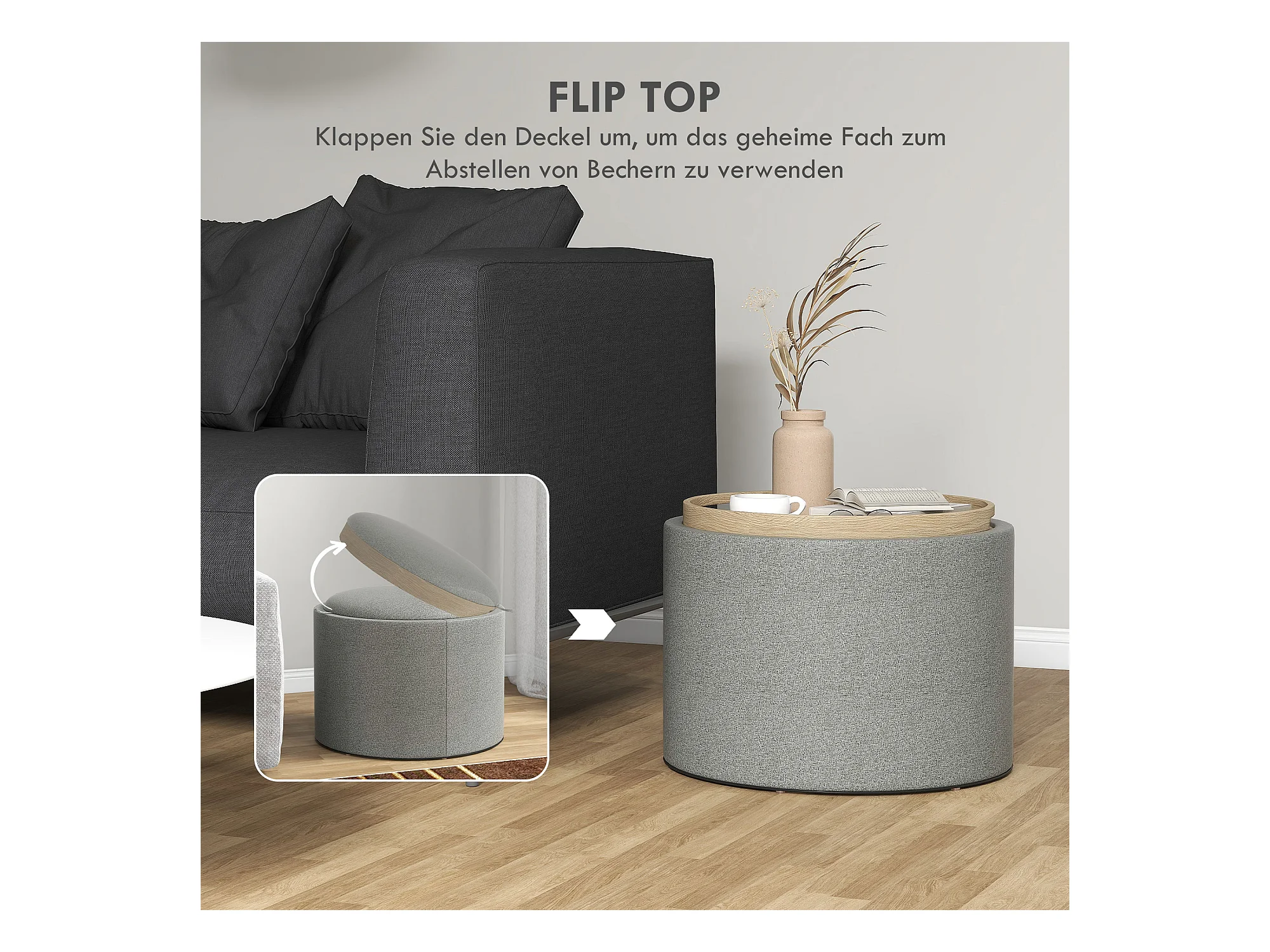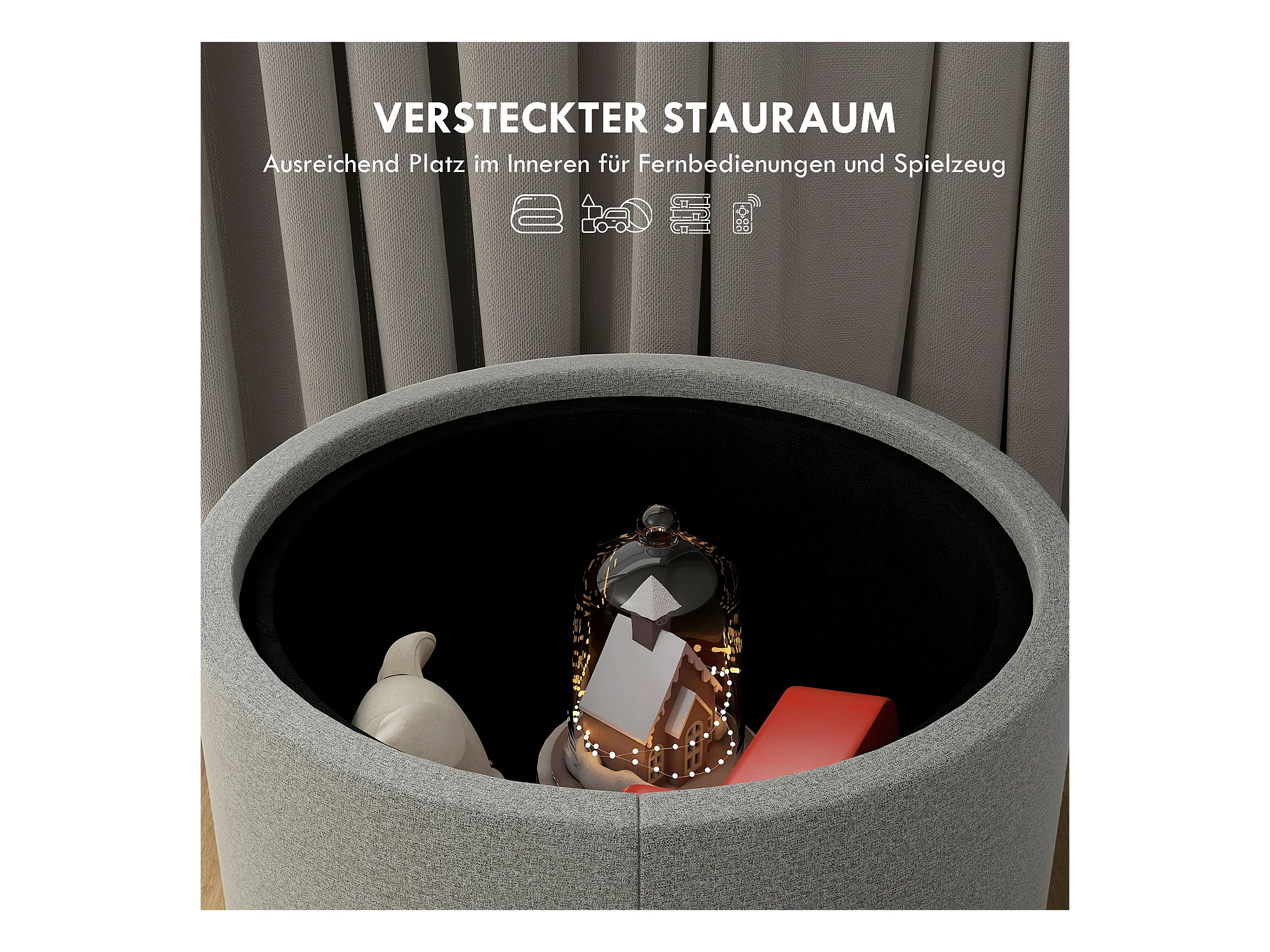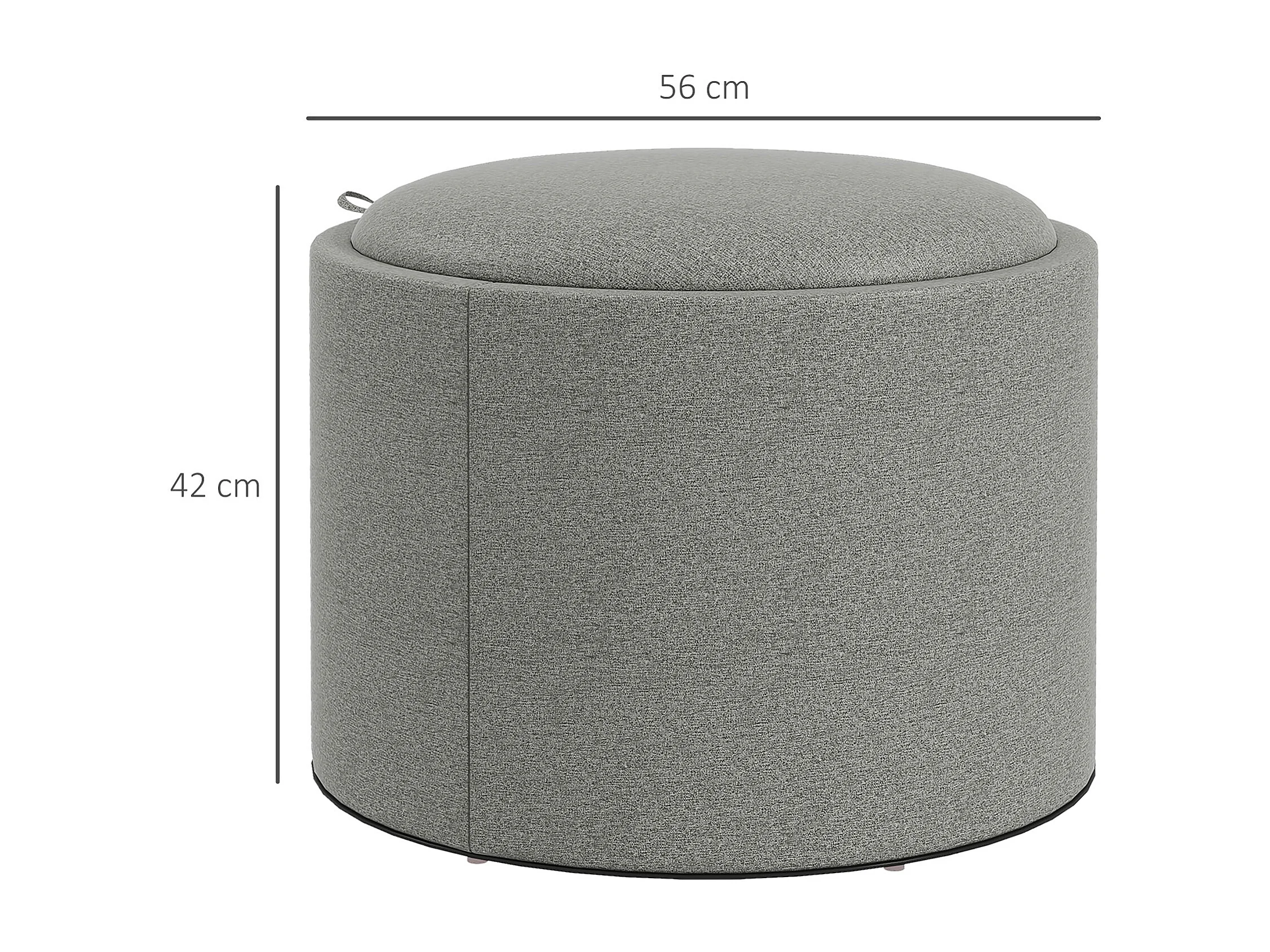 Ottomane ronde avec rangement et couvercle rabattable, tissu lin, gris (56x56x42 cm)
