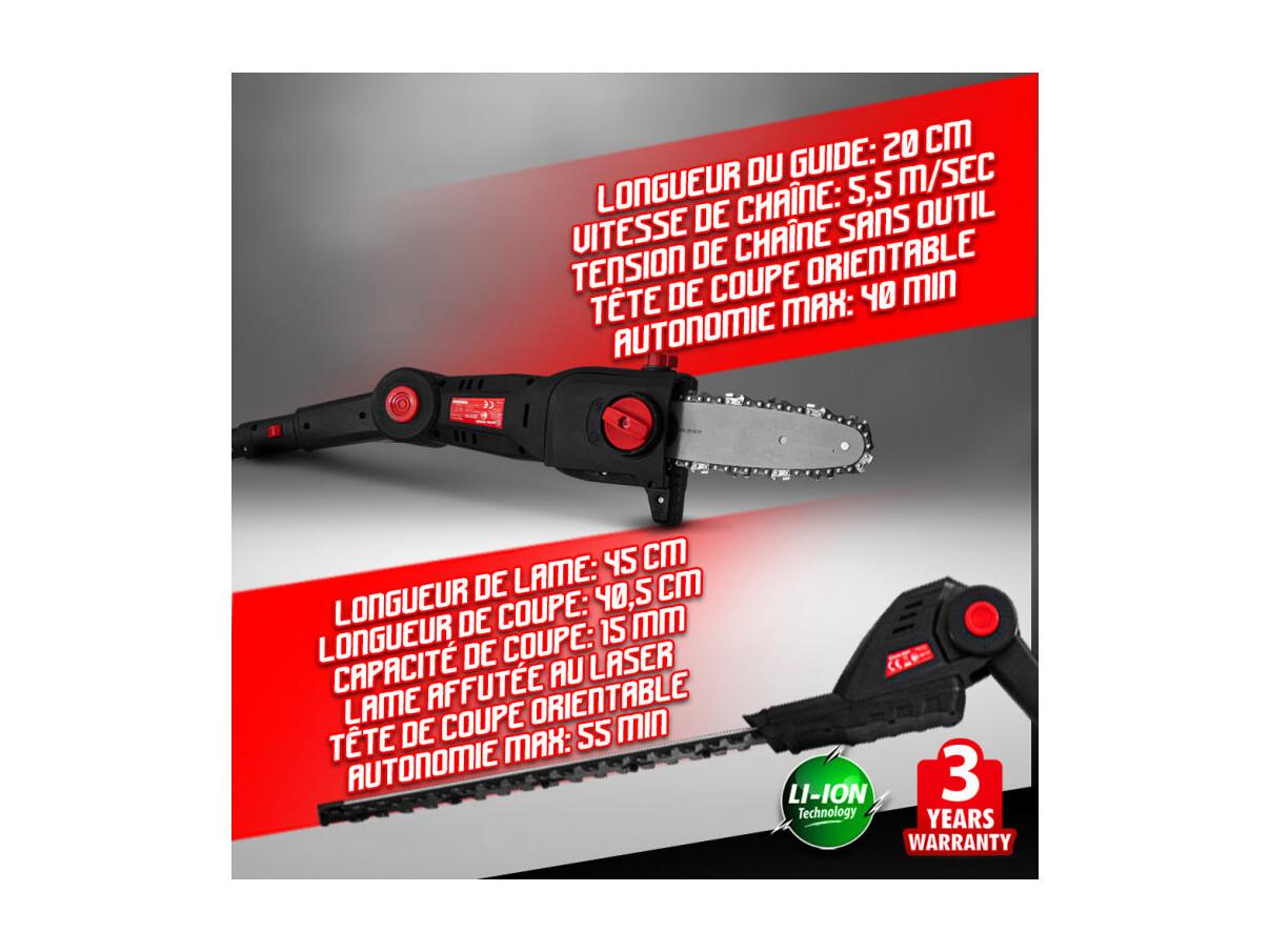 Élagueuse: L'élagueuse possède un guide de 20 cm. Elle dispose d'un système de tension de chaîne sans outil. Comme le taille haies, elle possède une tête de coupe orientable en fonction de vos besoins. La vitesse de la chaîne est de 5.5 m/sec. Elle dispose d'une autonomie de 40 min