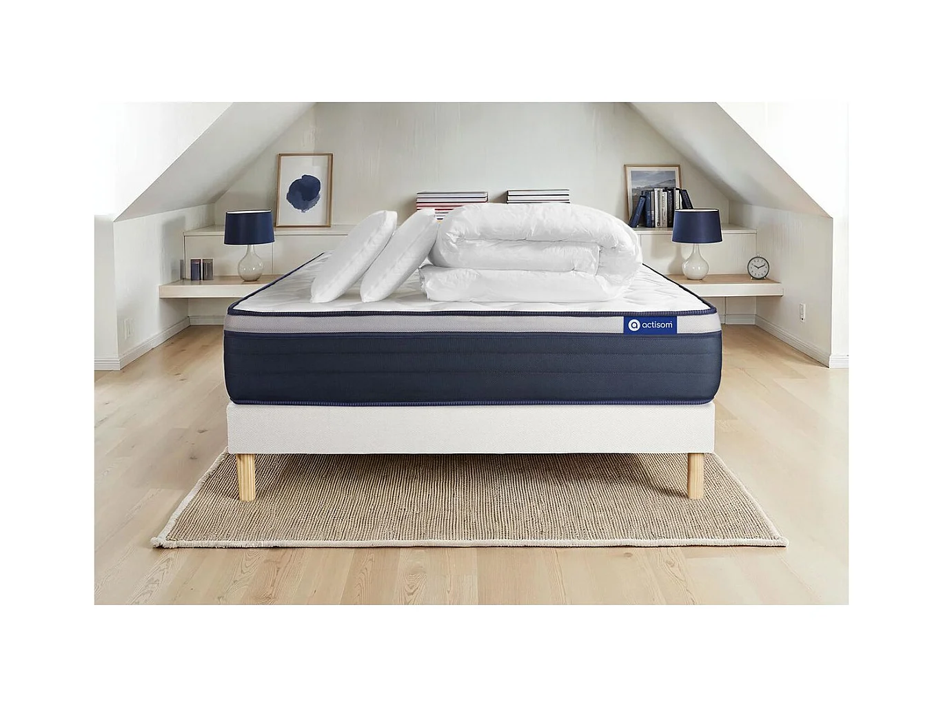 Pack prêt à dormir matelas à mémoire ACTIMEMO PUR 140x190cm 3zones de confort + sommier KIT blanc + 2 oreillers + couette