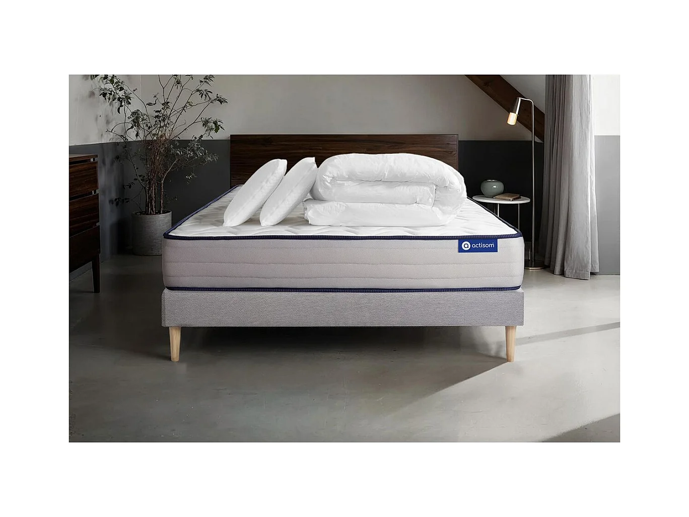 Pack prêt à dormir matelas Ressorts ensachés ACTIFLEX PUR 200x200 3zones de confort + sommier KIT gris + 2 oreillers+couette