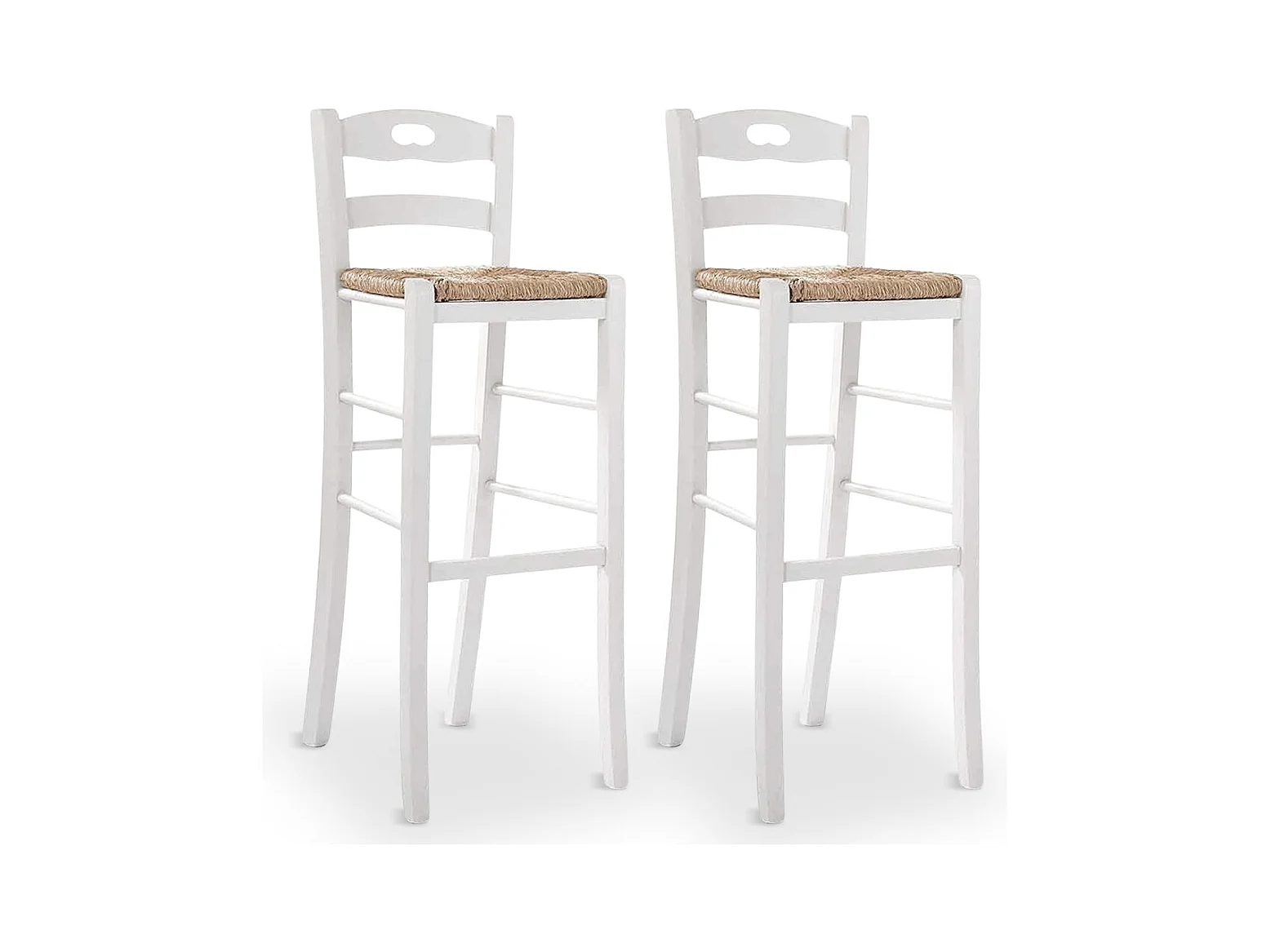 Paire de tabourets de bar en bois blanc de 80 cm de haut avec assise et poignée en paille.