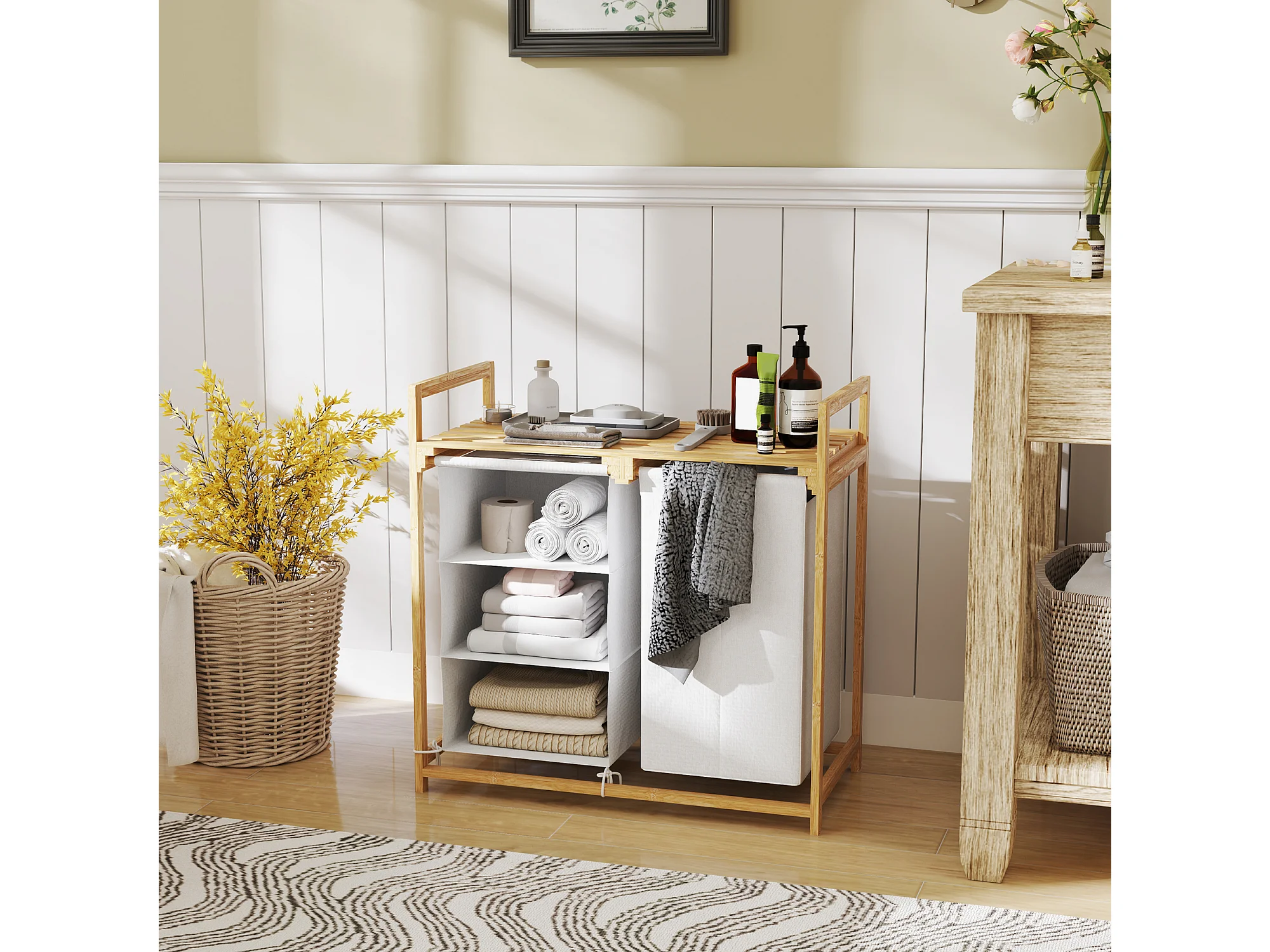 Panier à linge avec 4 compartiments, 2 sacs amovibles, bambou, blanc (70x36x70 cm)