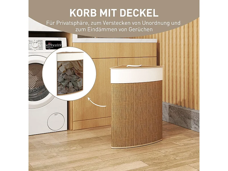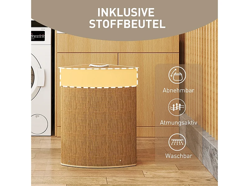 Panier à linge en bambou avec couvercle, 55L, design d'angle, avec sac amovible (35x35x60 cm)
