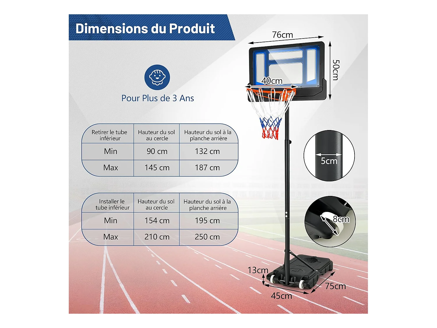 Panier de Basketball sur Pieds avec Hauteur Réglable 90-210 CM, Support de Basket à roulettes avec Base Remplissable Panneau en PE, pour Adultes ou 3 Ans+ (Bleu)