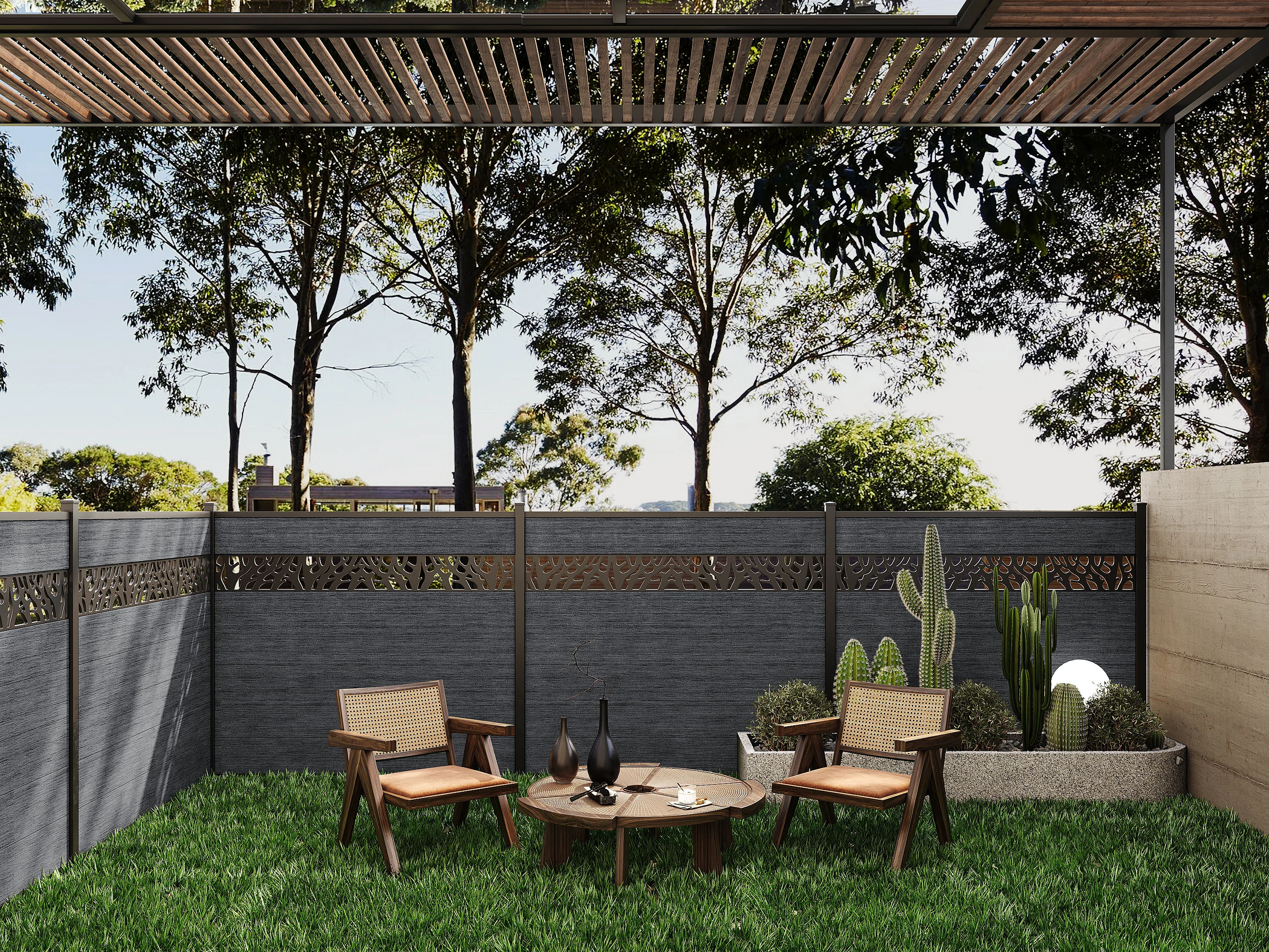 Clôture à enterrer H 181 cm - Kit 7 lames en composite avec décor + 2 poteaux anthracite - ENOLA