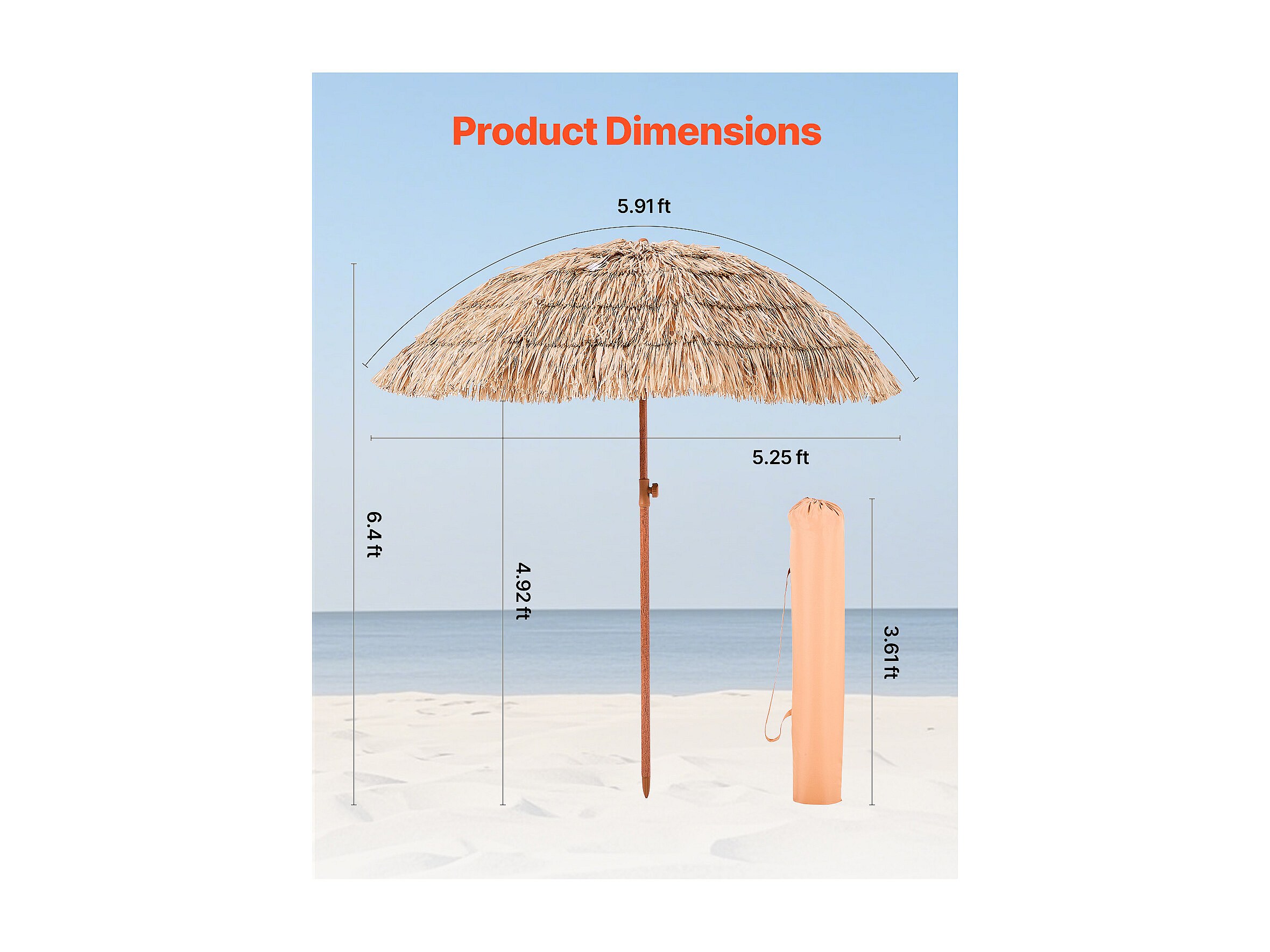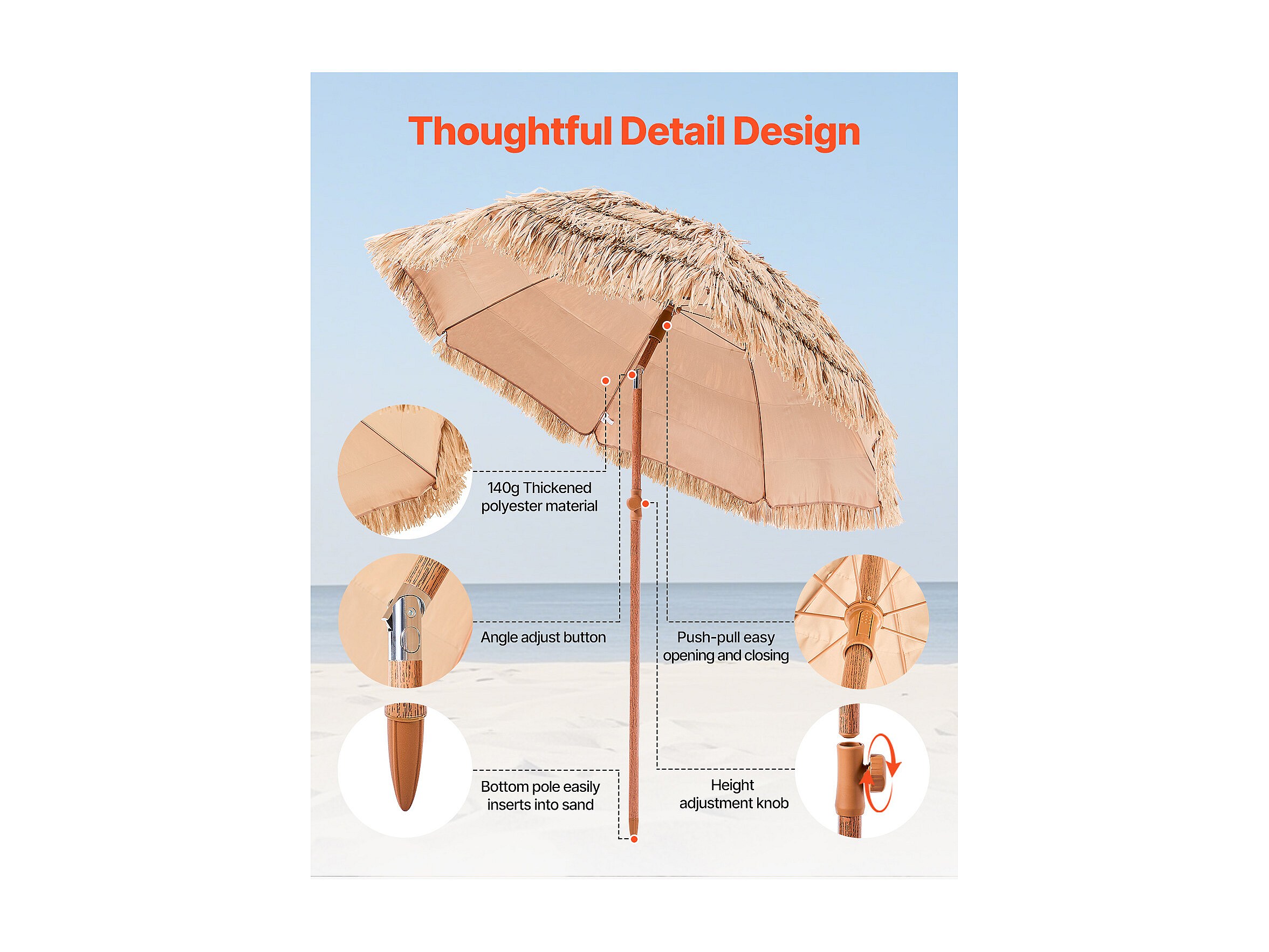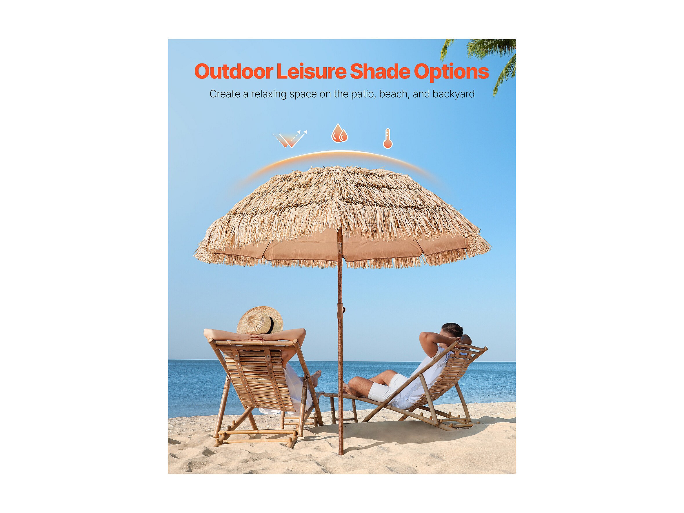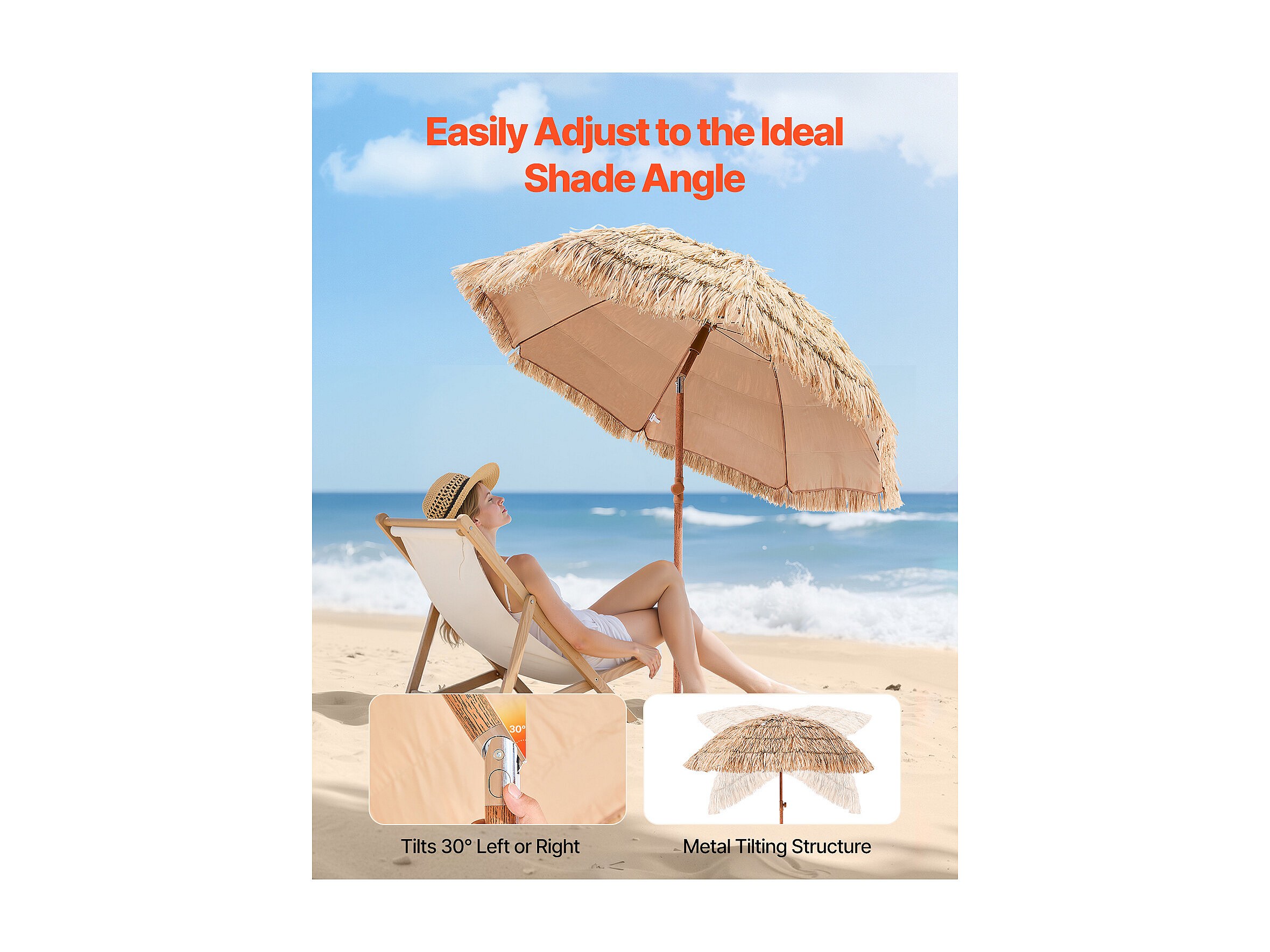 Parasol Hawaïen SucceBuy, 1,8 m Parasol Exotique Inclinable avec Toit Chaume PP, 8 Baleines Métalliques, pour Plage, Terrasse, Bord de Piscine, Jardin