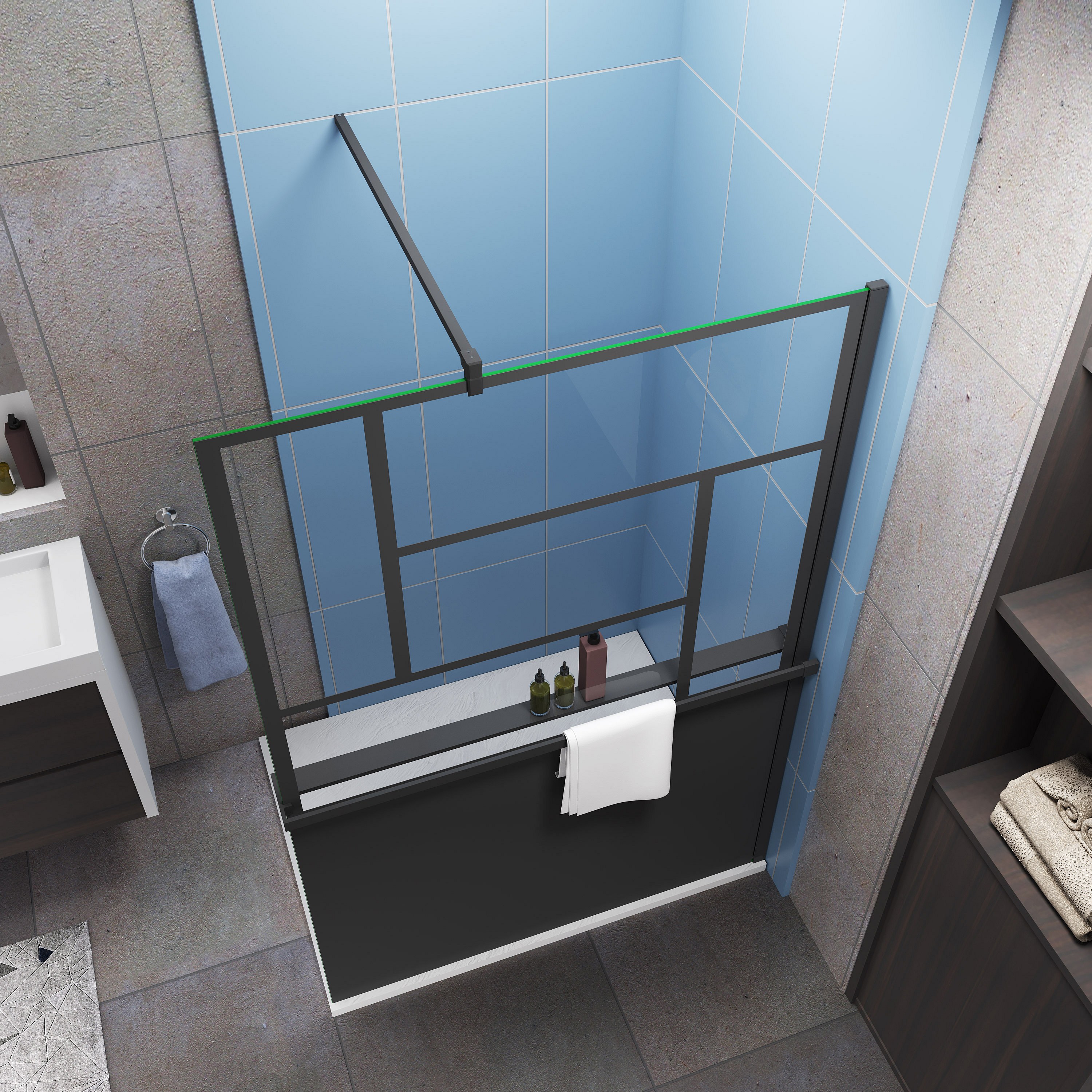 Paroi de douche 100x200cm style industriel + Étagère Douche 100cm noir + 8mm verre sécurité + barre fixation avec pince 140cm