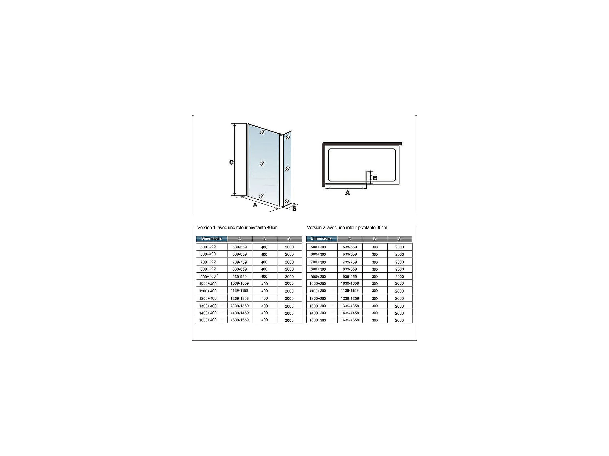 Paroi de douche à l'italienne verre dépoli au centre 140+30x200cm avec retour pivotant, avec barre de fixation 73-120cm