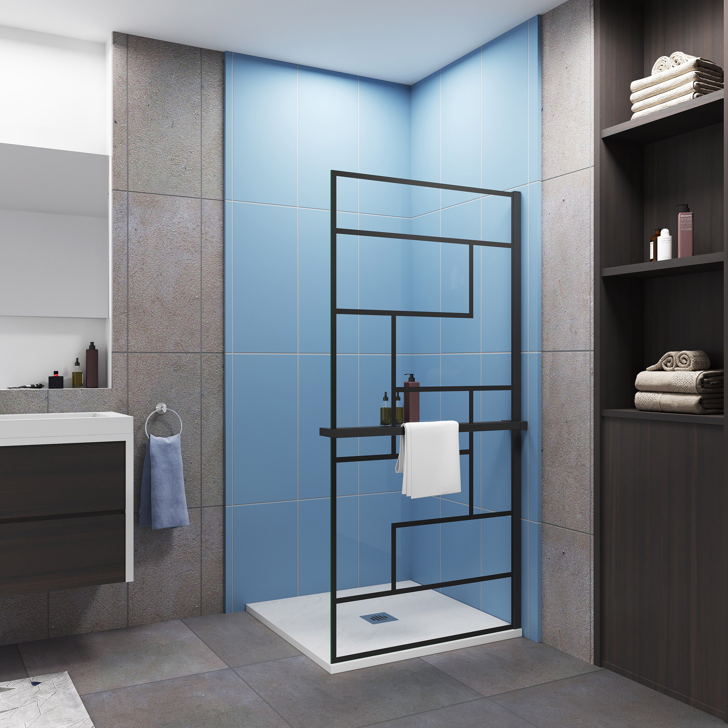 Paroi de douche fixe 90x200 cm + Barre de fixation 140cm avec pince + Étagère de Douche 90cm en alu - verre 8 mm anticalcaire - Noir mat