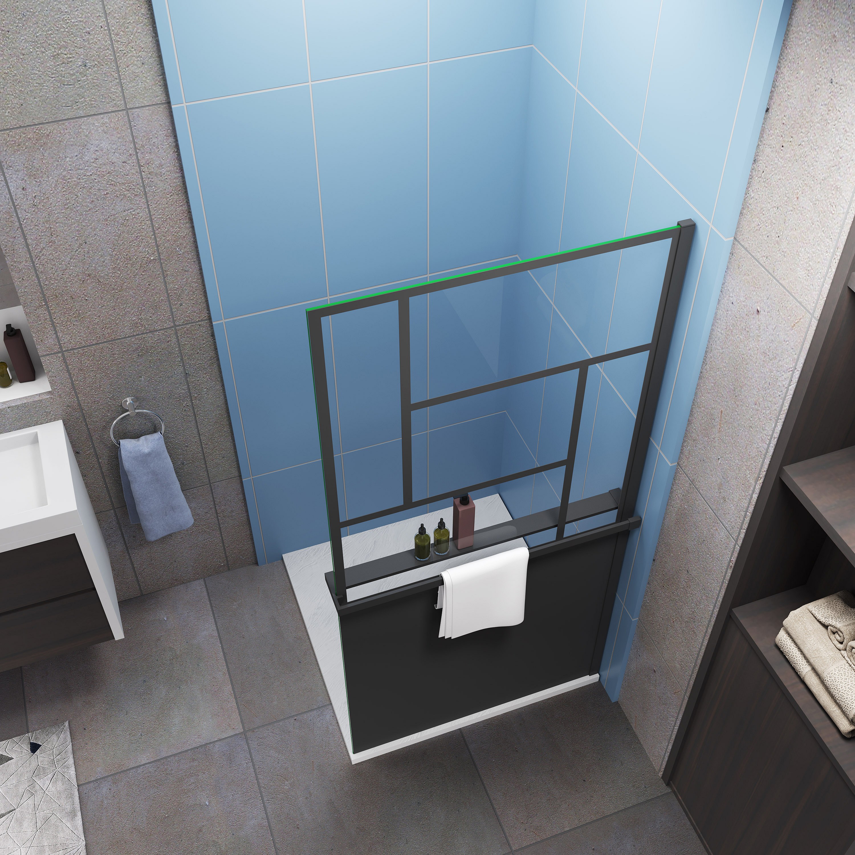 Paroi de douche 90x200cm style industriel + Étagère de Douche 90cm alu noir + 8mm verre anticalcaire + barre fixation 73-120cm