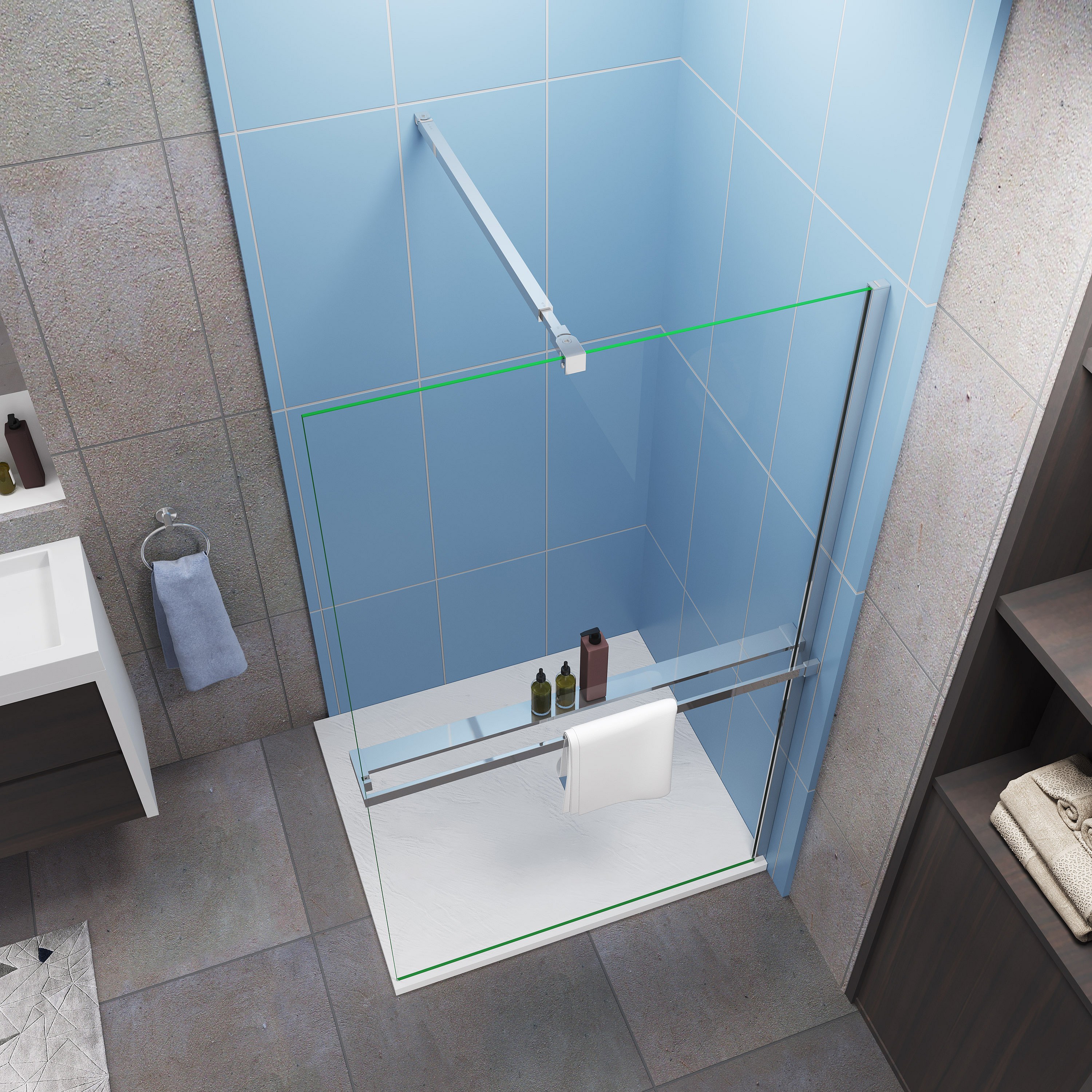 Paroi de douche à l'italienne Chrome 100x200cm - 8mm verre anticalcaire + Barre de fixation 90cm + Étagère de Douche 100cm alu