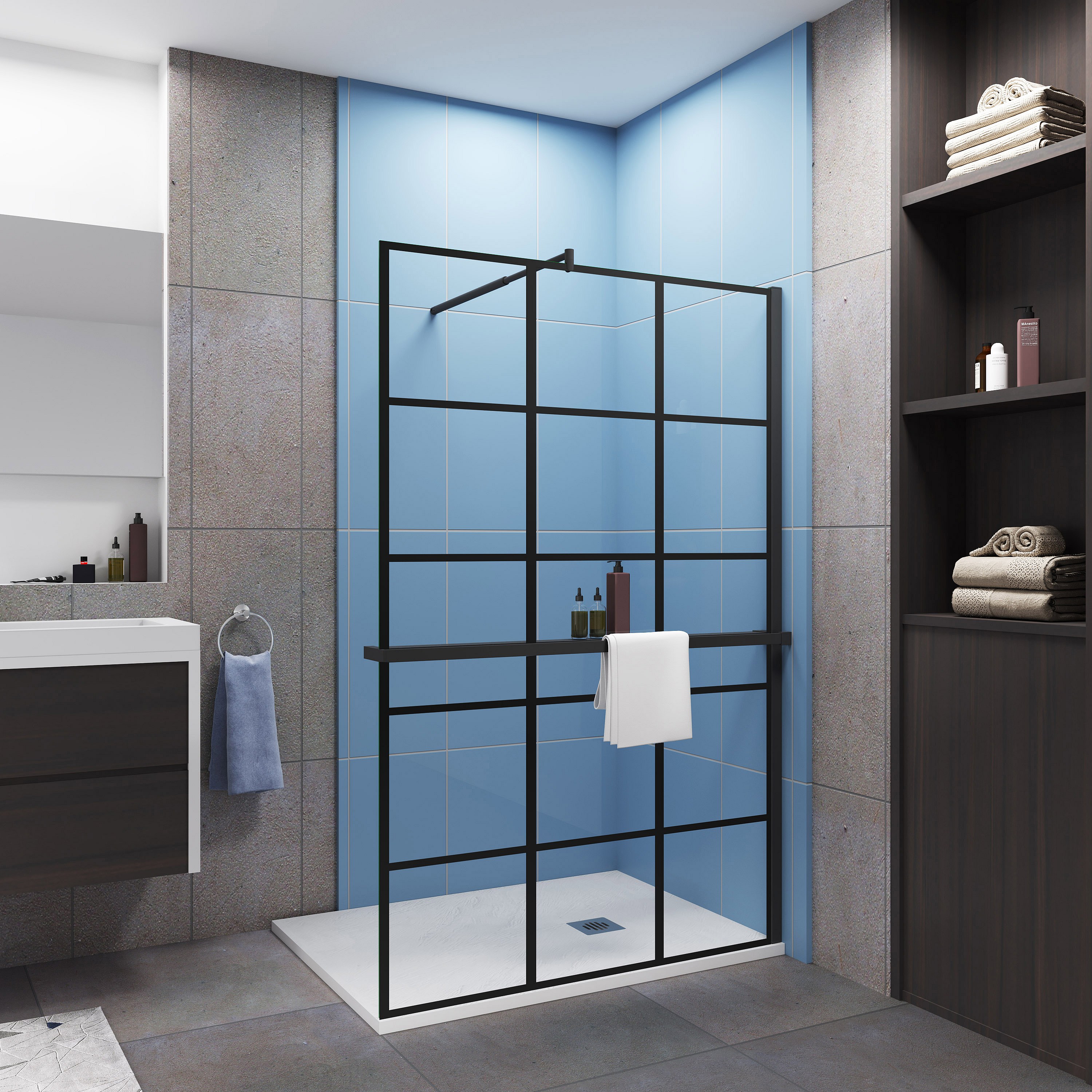 Paroi de douche fixe 140x200 cm + barre de fixation 140cm + Étagère de Douche 140cm en alu - verre 8 mm anticalcaire - Noir mat