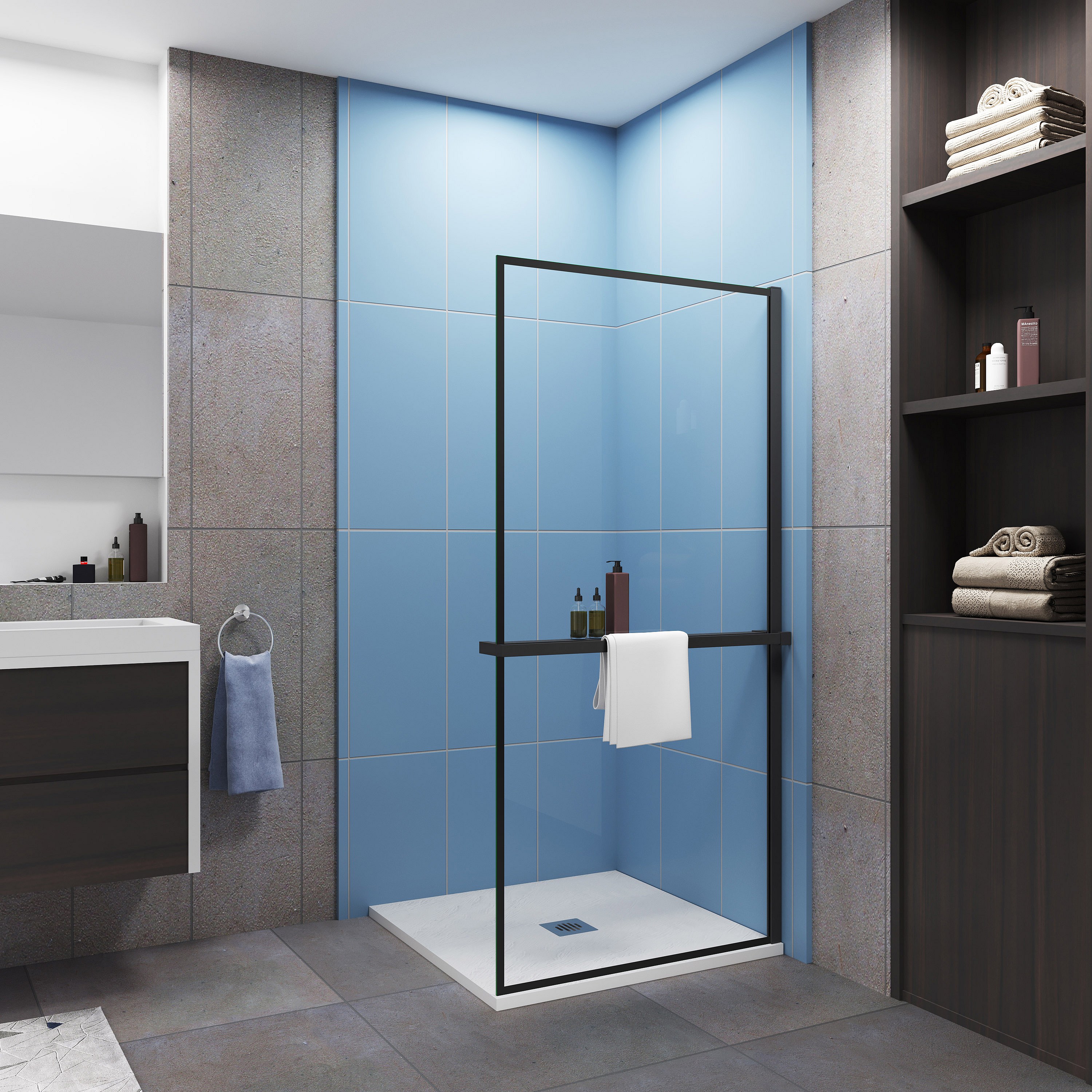 Paroi de douche fixe 90x200 cm + Barre de fixation 140cm avec pince + Étagère de Douche 90cm en alu - verre 8 mm anticalcaire - Noir mat