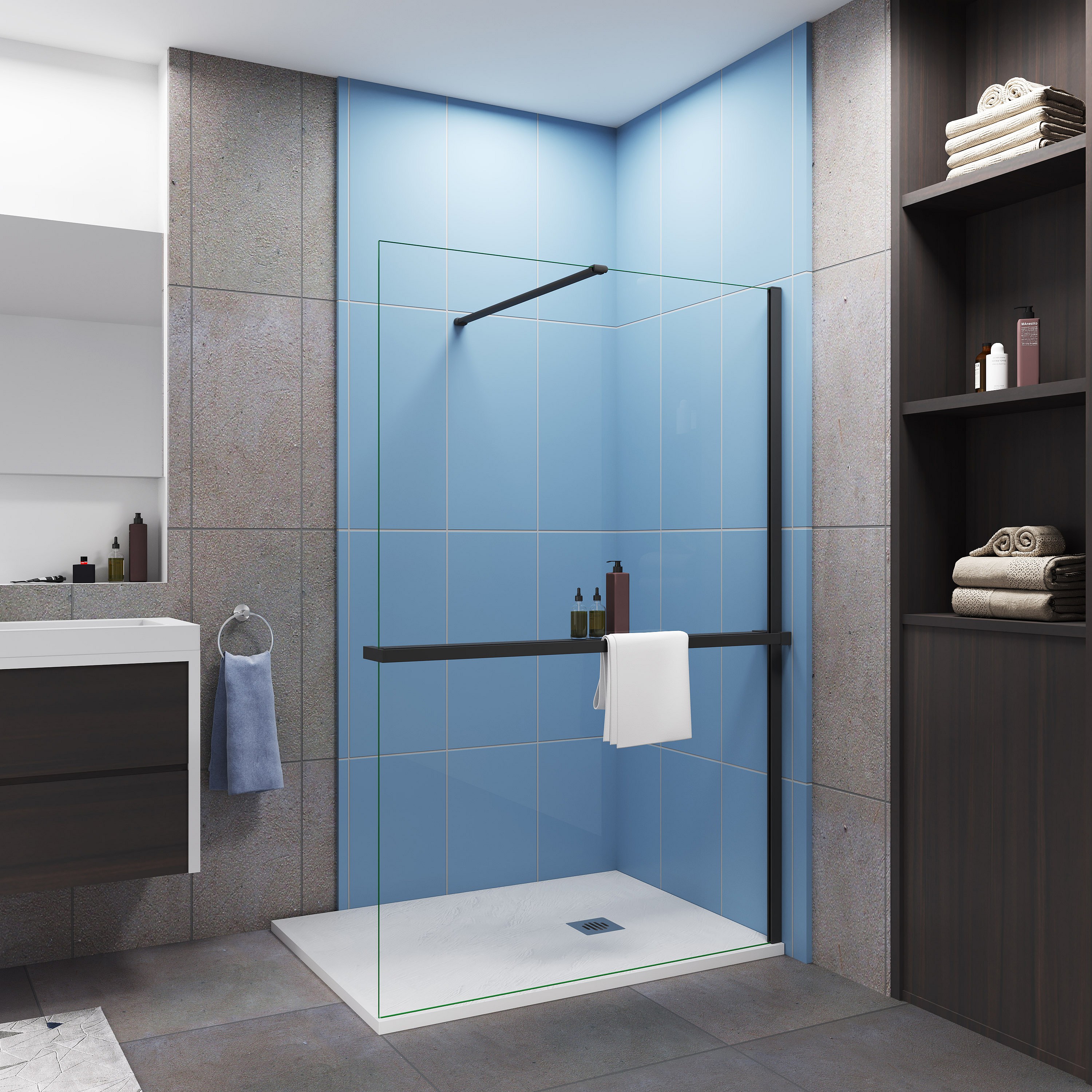 Paroi de douche fixe 120x200 cm - verre 8 mm anticalcaire - Noir mat + Étagère de Douche 120cm en alu