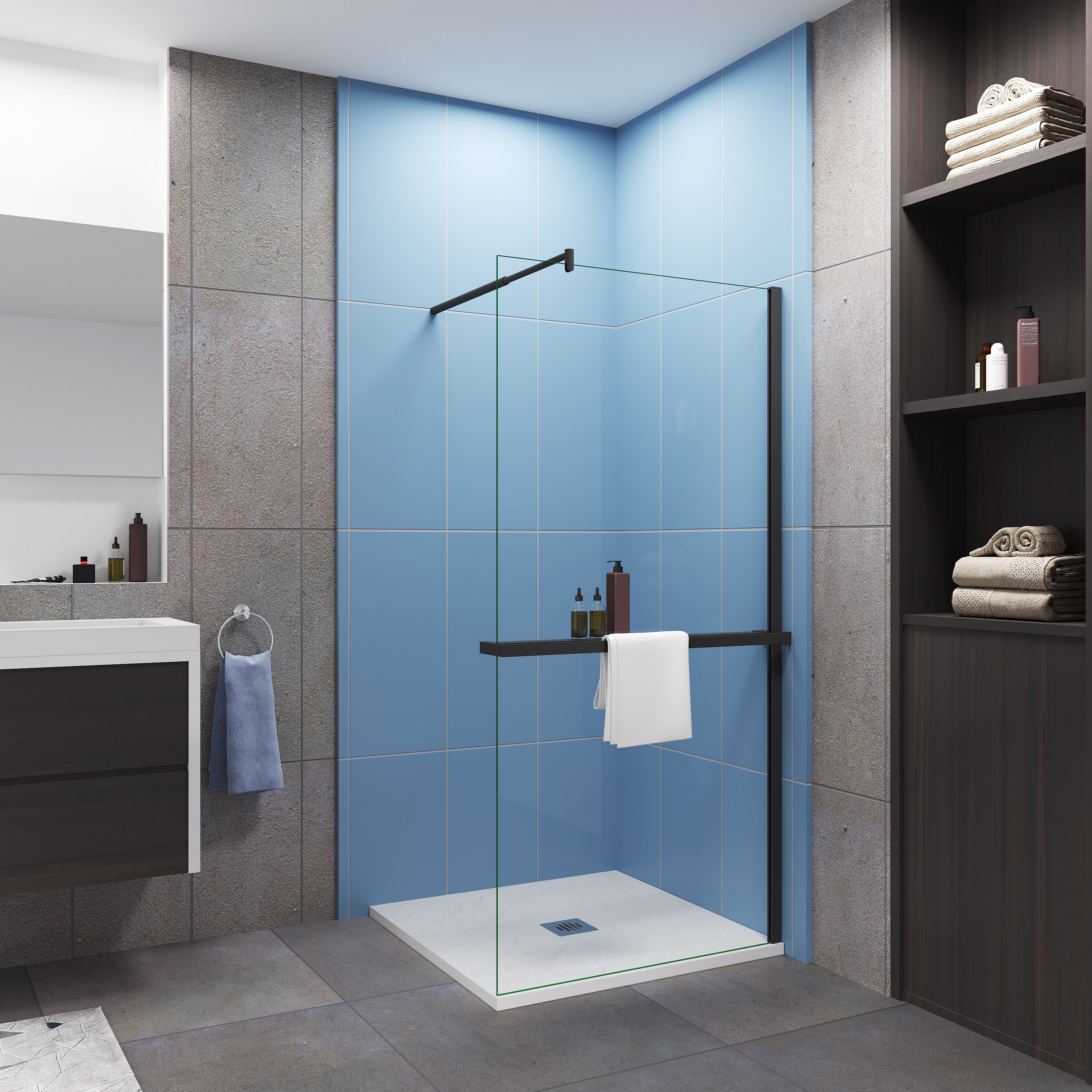 Paroi de douche fixe Noir 80 x 200cm - 8mm verre anticalcaire + Étagère de Douche 80cm + barre de fixation 140cm avec pince
