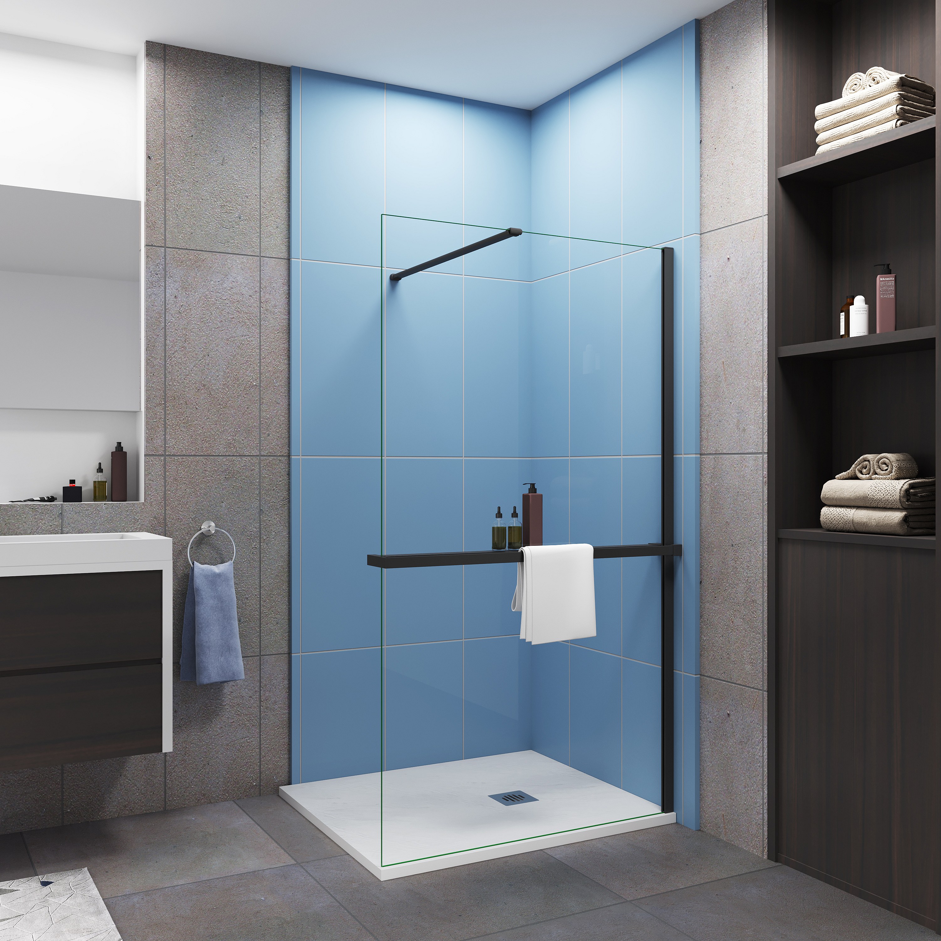 Paroi de douche fixe 9100x200 cm + barre de fixation 140cm + Étagère de Douche 100cm en alu - verre 8 mm anticalcaire - Noir mat