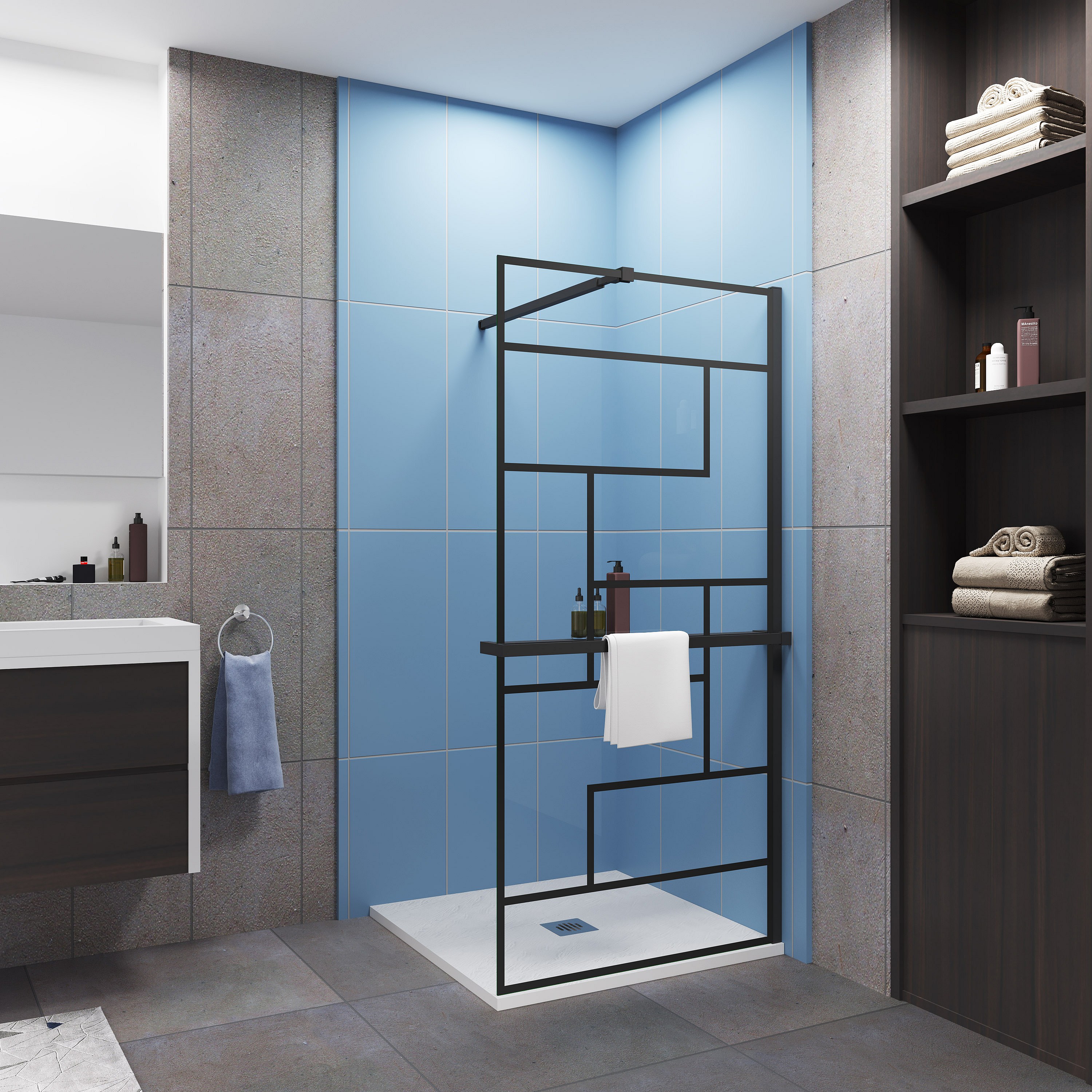 Paroi de douche fixe 9100x200 cm + barre de fixation 140cm + Étagère de Douche 100cm en alu - verre 8 mm anticalcaire - Noir mat
